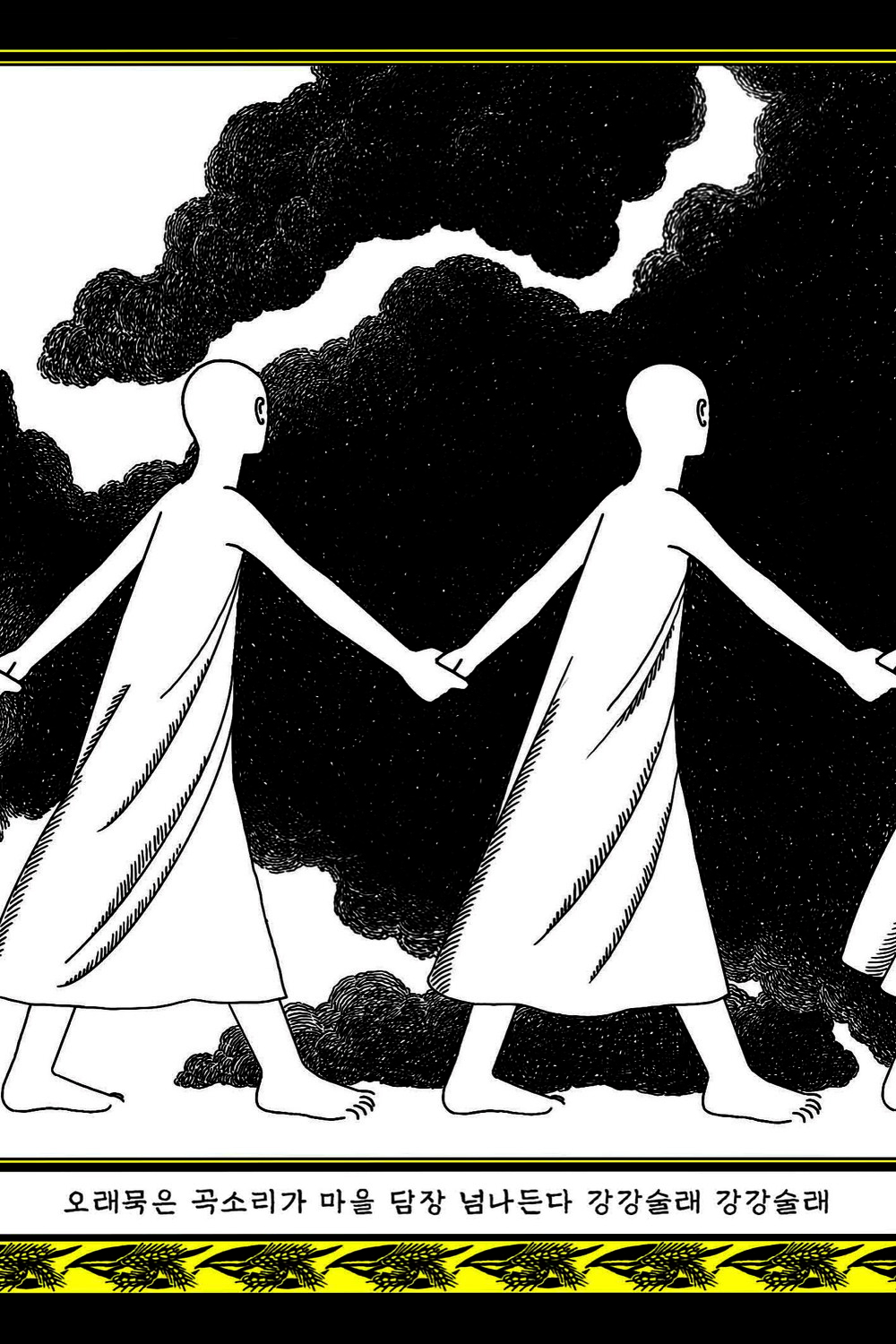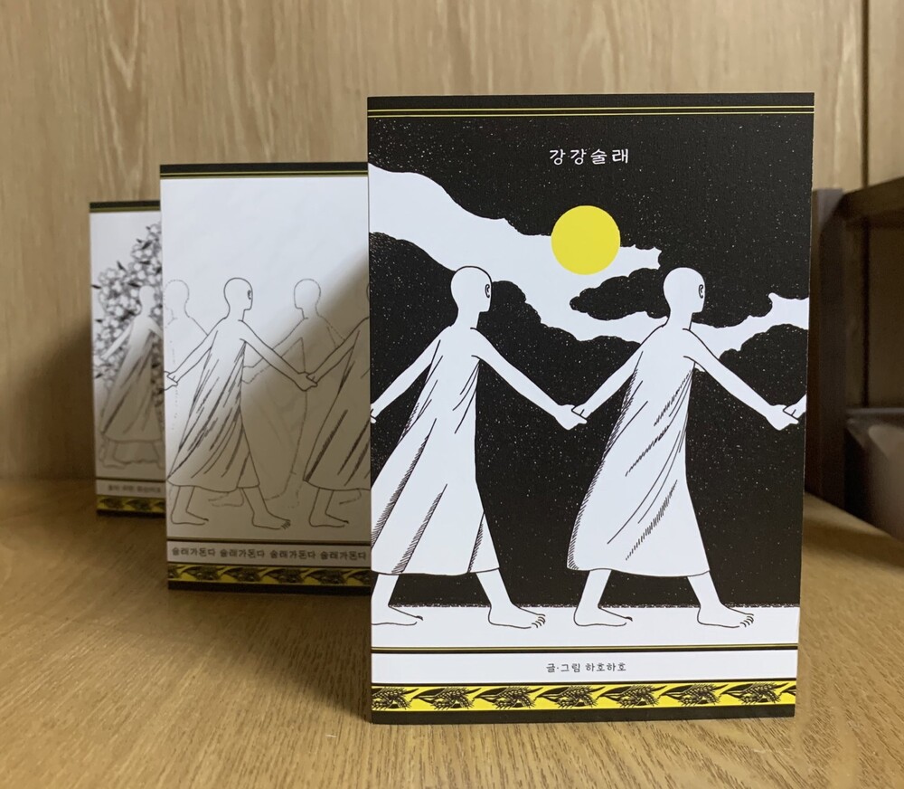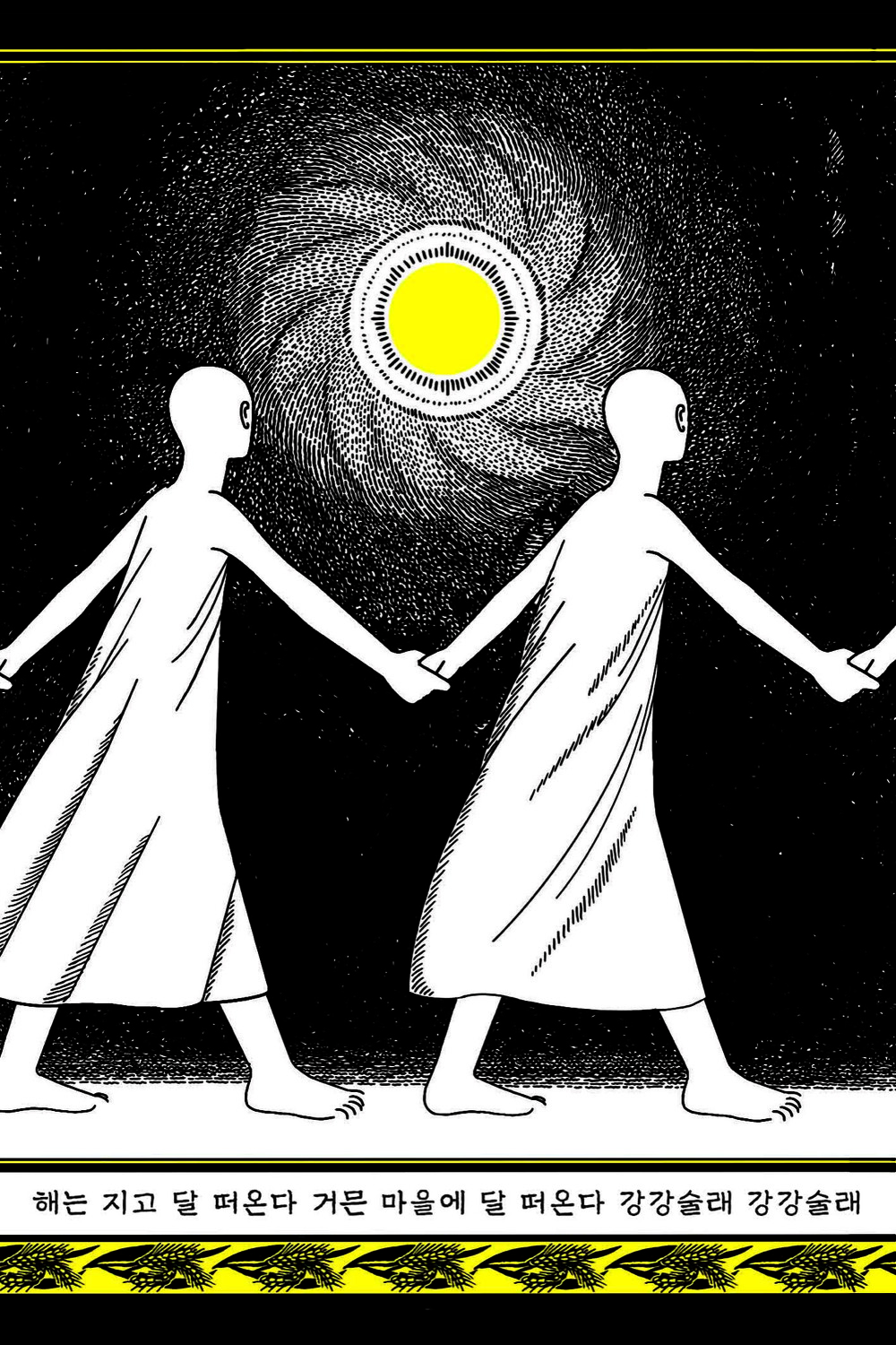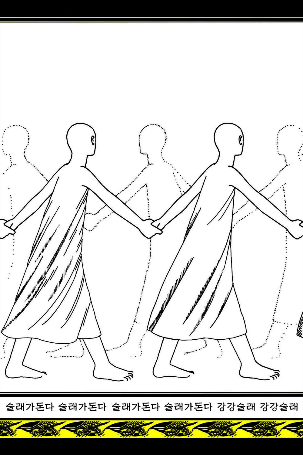 인물들이 반복적으로 등장하며, 강강술래 노래가사를 담은 아코디언 북입니다.