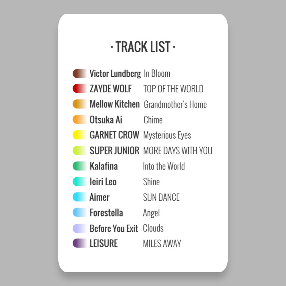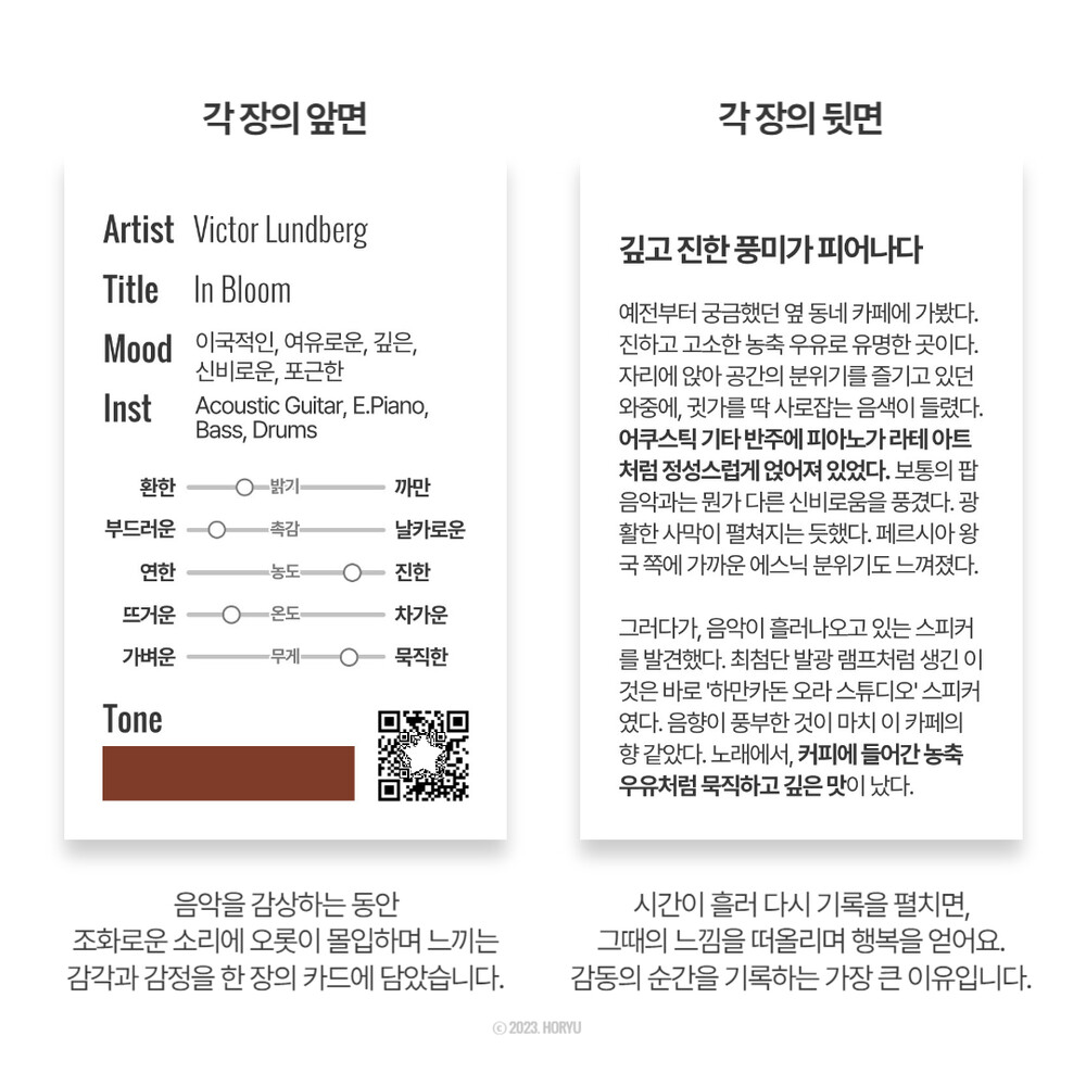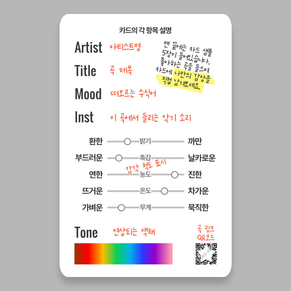 카드의 앞면에는 각 곡의 특징을 키워드와 오감 스펙트럼으로 표현했고