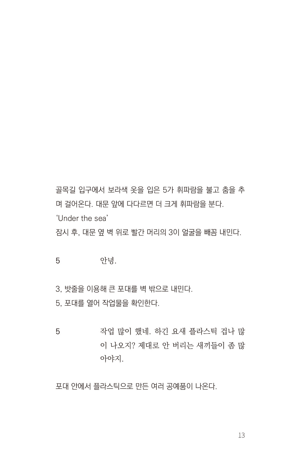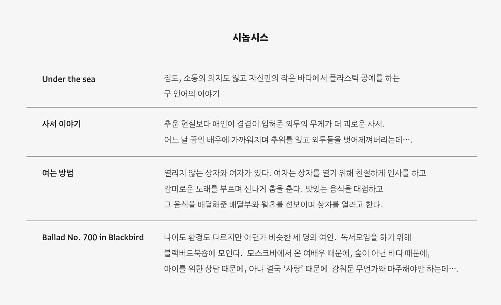 1. Under the sea: 집도, 소통의 의지도 잃고 자신만의 작은 바다에서 플라스틱 공예를 하는 구 인어의 이야기.