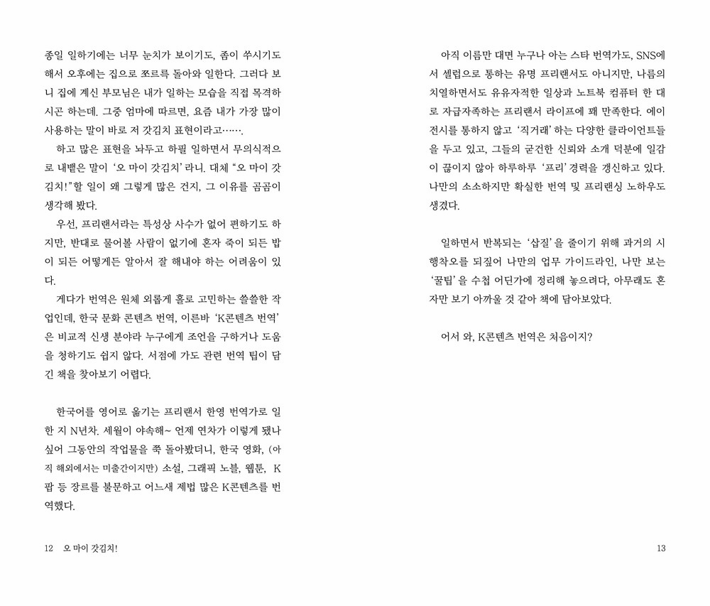 한국 문화 콘텐츠라는 특수한 분야를 영어로 번역하는 저자의 프리랜싱 일상과 그만의 유별나고 독특한 번역 꿀팁들을 듬뿍 담은 실용 에세이 『오 마이 갓김치! K 콘텐츠 번역가의 생존가이드』를 소개합니다.
