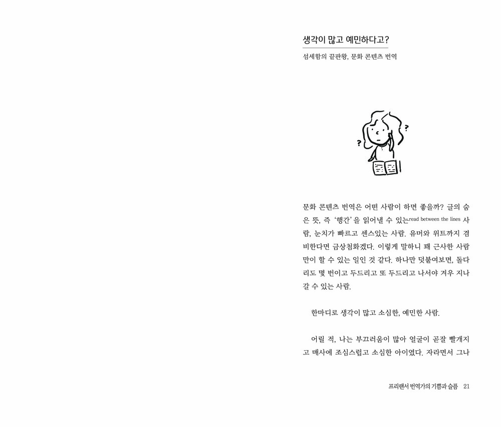 변화무쌍한 K콘텐츠를 그때그때 다르게, 장르에 맞춰 옮기는 ‘카멜레온 번역가’. 한국 문학과 영화, 웹툰, 그래픽 노블, K팝 콘텐츠 등을 영어로 번역한다. 좋아하는 일을 한다고 자부했는데, 즐겨보던 온갖 문화예술 콘텐츠가 번역의 교재이자 골치 아픈 공부거리로 변해버렸다. 그럼에도 ‘나는 세계에 자랑스러운 한국 문화를 소개하고 있다’며 위풍당당, 콘텐츠에 둘러싸여 다채로운 일상을 영위한다.