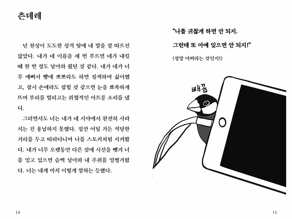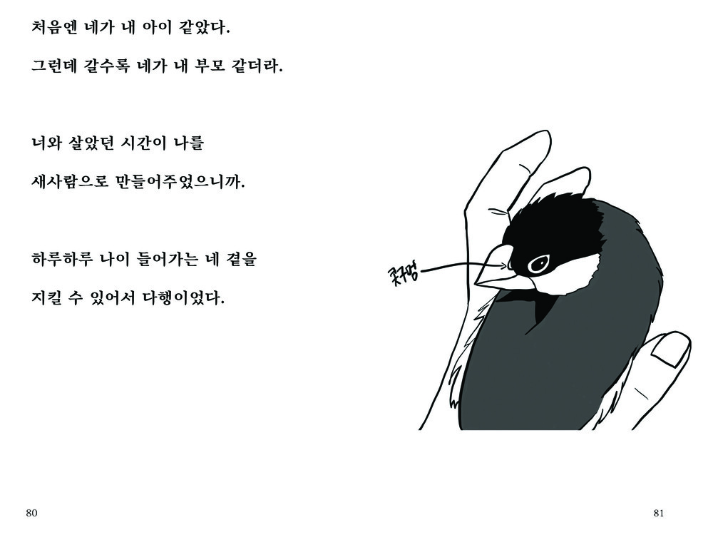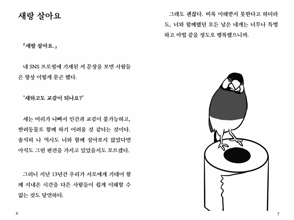 네가 세상을 떠난 지금 나는 이 글을 쓴다. 비록 새인 너와 깊이 교감하며 함께 살았던 나의 삶을 그 누구로부터 이해도, 공감도 받지 못한다고 할지라도. 나는 그저 나의 소중한 친구인 너를 오래도록 기억하고 싶기 때문이다.