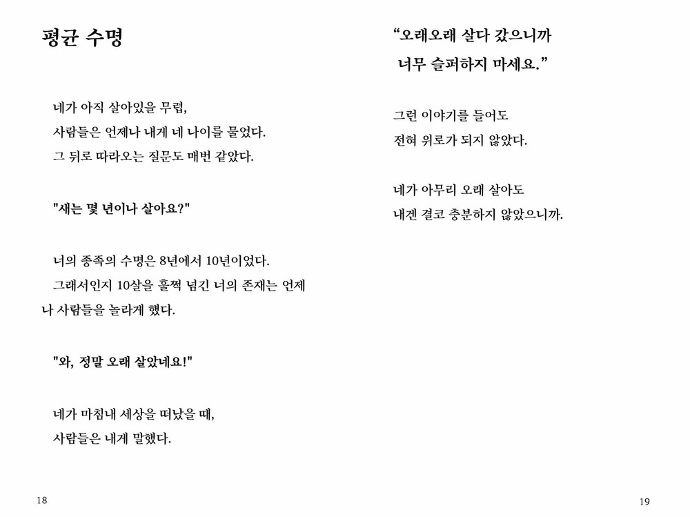 평균 몸무게 26g밖에 되지 않는 작은 소동물인 문조. 저자는 그가 인간보다 빠른 속도로 늙어 가는 모습, 그리고 마침내 세상을 떠나는 과정을 제 인생의 ‘미리 보기’로 받아들인다.