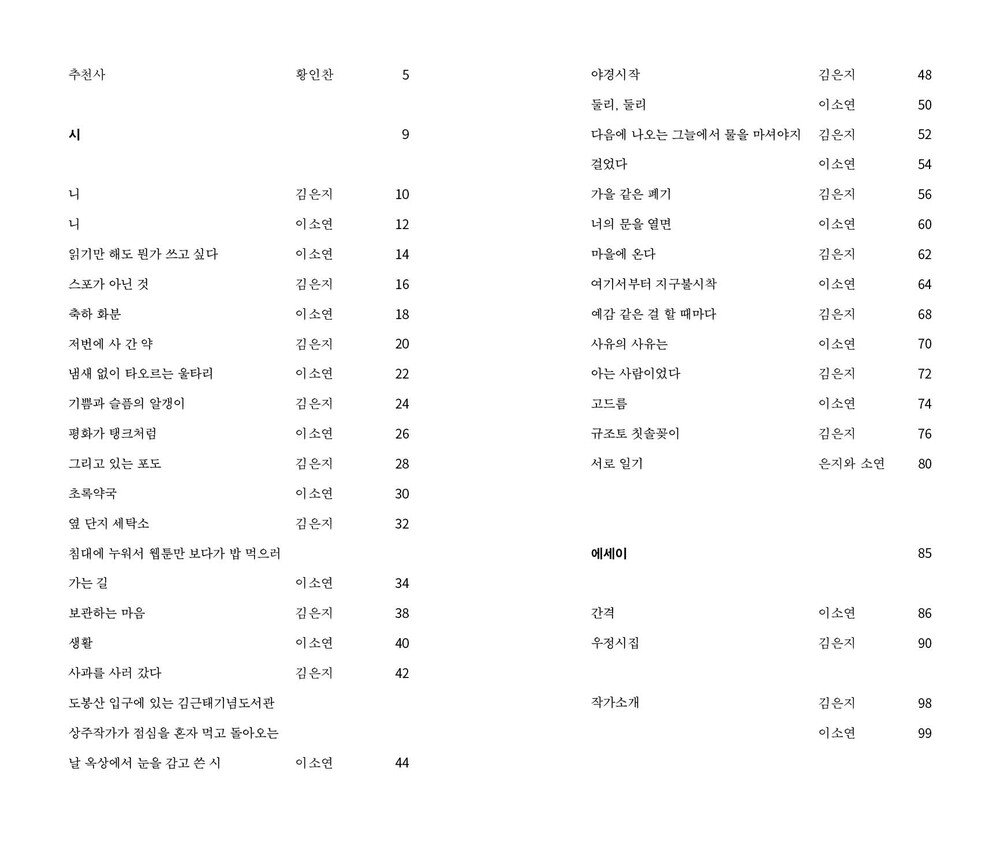 김은지와 이소연 두 시인이 함께 발을 맞춘 이 시집에는 두 사람이 같은 시간을 공유하며 보고 듣고 느낀 것들이 담겨 있고,