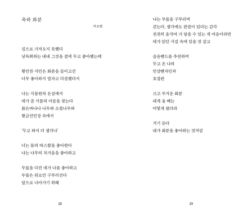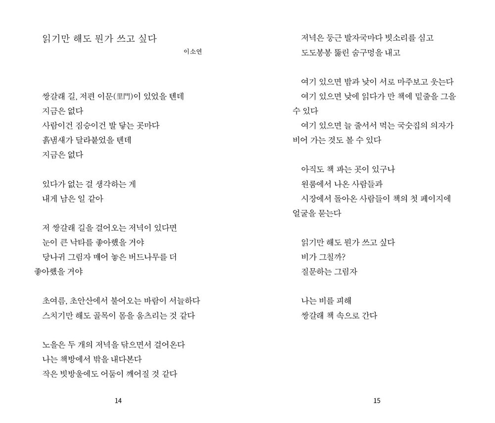 한 시인의 고백이 다른 시인의 내면을 보여주는 것만 같고, 때로는 두 시인의 목소리가 마치 하나인 것처럼 느껴지기도 한다.