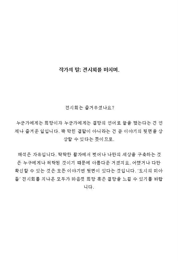 도시의 미아들'은 누군가의 잃어버린 삶을 기록하여 전시한 전시록입니다.