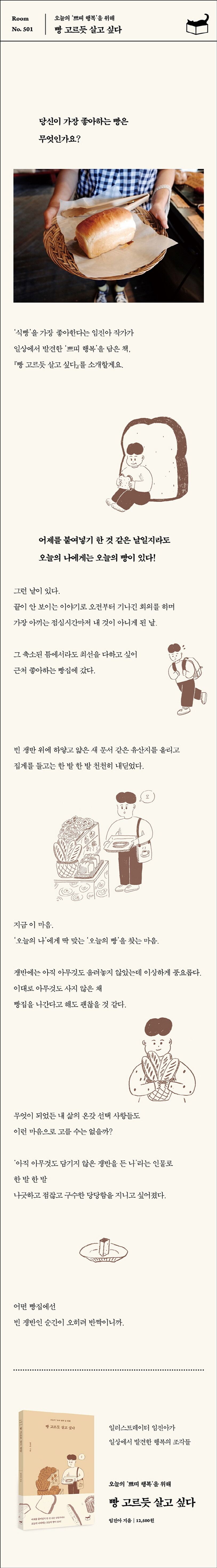 우리는 지금 고소한 냄새가 풍기는 빵집에 들어섰습니다. 빈 쟁반에 새하얀 유산지를 깔고, 조금은 비장한 표정으로 설렘을 품고 빵 집게를 쥐어요. 그리고 빵들 앞에 섭니다. 식빵, 크림빵, 치아바타, 소보로빵부터 예쁘고 화려한 케이크까지 다양한 빵들이 나를 보고 있습니다. 나는 어떤 빵을 좋아할까요? 오늘의 나는 어떤 빵을 먹고 싶은 걸까요? 당당히 좋아하는 빵을, 먹고 싶은 빵을 빈 쟁반에 올려놓을 때의 그 행복감처럼, 거창하지도 특별하지도 않지만 일상을 살아가게 하는 작고 귀여운 행복을 담은 책입니다.