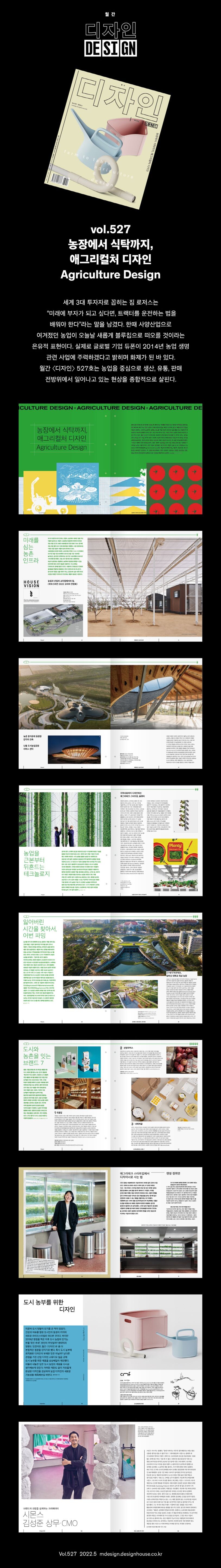 세계 3대 투자자로 꼽히는 짐 로저스는 "미래에 부자가 되고 싶다면, 트랙터를 운전하는 법을 배워야 한다"라는 말을 남겼다. 한때 사양산업으로 여겨졌던 농업이 오늘날 새롭게 블루칩으로 떠오를 것이라는 은유적 표현이다. 실제로 글로벌 기업 듀폰이 2014년 농업 생명 관련 사업에 주력하겠다고 밝히며 화제가 된 바 있다. 월간 〈디자인〉 527호는 농업을 중심으로 생산, 유통, 판매 전방위에서 일어나고 있는 현상을 종합적으로 살핀다.