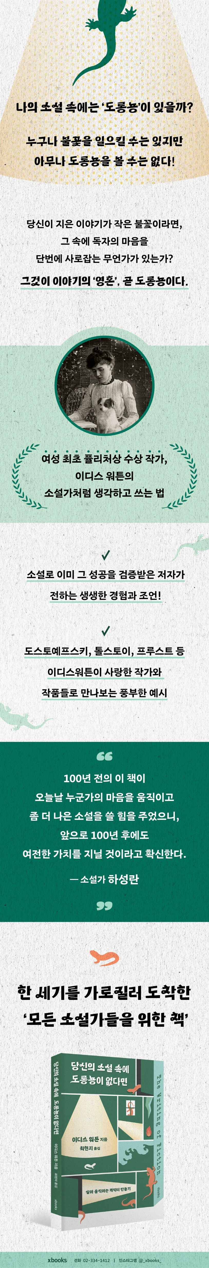 『당신의 소설 속에 도롱뇽이 없다면』(The Writing of Fiction)은 여성 최초로 퓰리처상을 수상한 이디스 워튼의 ‘소설 쓰기’에 관한 에세이다. 『순수의 시대』(1920)의 성공 이후 쓰인 이 책은, 현대소설의 뿌리와 그 발전, 소설의 구성, 인물, 상황과 작가로서 내려야 하는 선택 등 소설을 쓰기 위해 알아야 할 다양한 접근법들을 다룬다. 특히 그 시대의 ‘여성 작가’가 소설이라는 장르 자체를 탐구하고 논의하였다는 점에서 현대문학사의 귀중한 가치를 지닌다. 1925년에 쓰였음에도 불구하고 그녀가 짚는 소설의 요소들은 여전히 중요하며 소설 창작을 둘러싼 물음과 명확한 관점들은 작가로서 막 발걸음을 내딛으려 하는 이들에게 더없이 유용하다.