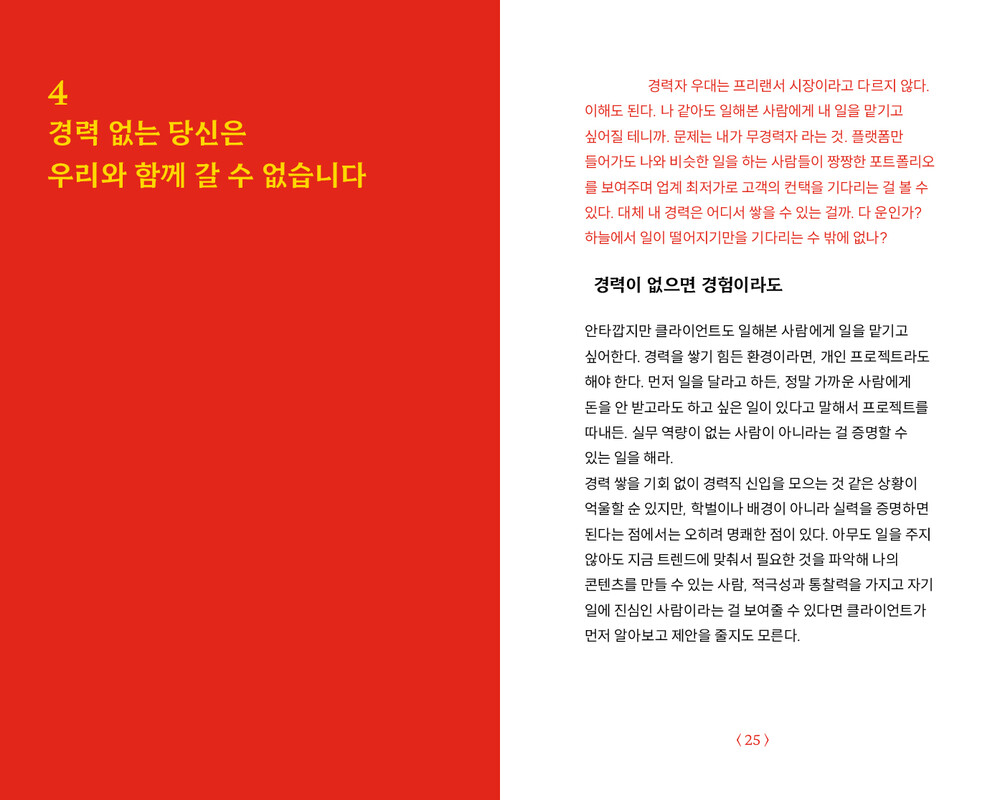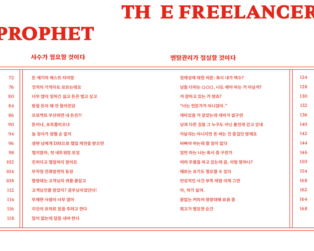 프리랜서가 된 당신, 아무도 일을 가르쳐 주지 않아서 여기저기에 당하고 있진 않았는가. 회사원인 당신, 늘 마음 속에 사직서를 품고 언젠가 내 일을 하려고 하진 않았는가. 꿈 많고 방법 모르는 당신, 사업! 사업! 사업! 노래를 부르지만 혼자서는 엄두가 안 나서 늘 아이디어 노트만 빼곡하진 않은가. 그런 당신을 위한 가이드북이 있다. 무릎이 닿기도 전에 이미, 당신이 갖고 있을, 곧 갖게 될 질문을 이미 알고 해답을 알려줄 바로 그 책, 프리랜서 예언집. 지지부진한 고민을 끝내고, 이제 실행을 말하고 싶은 당신을 위해 추천한다. 책을 여는 순간 일을 시작하게 될테니!