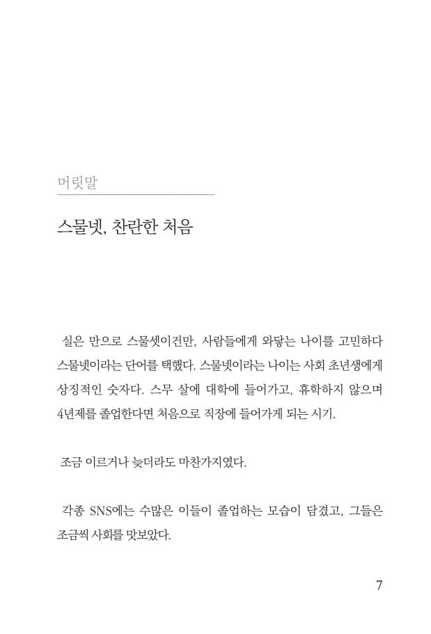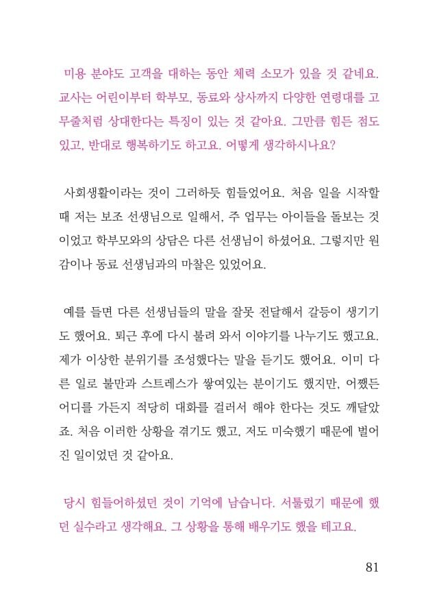 무엇을 하든 늦었다고 생각하지 말고, 하고 싶은 일에 도전해 보세요. 왜냐하면 이 세상에는 저도 있으니까요. (웃음) 무엇이든 괜찮다고, 늦지 않았다고요. 웬만하면 저보다 빠르지 않을까요?-수능을 다섯 번|대학생 유리 (p.92)