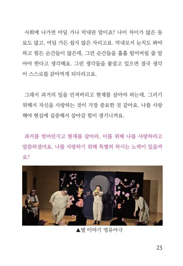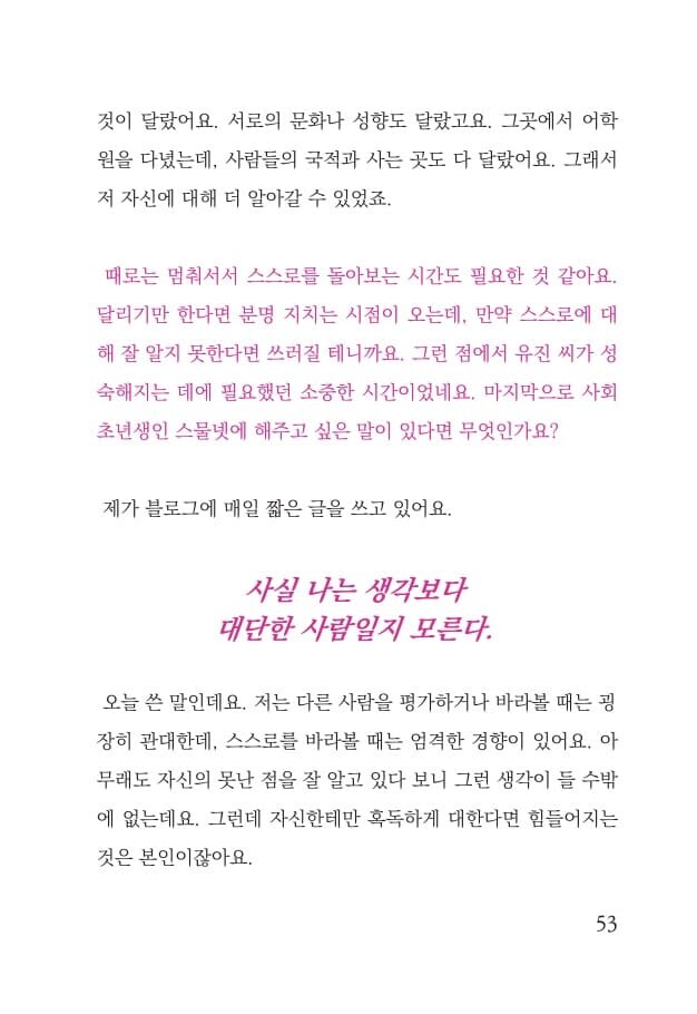 사회에 나가면 어딜 가나 막내란 말이죠? 나이 차이가 많은 동료도 많고, 어딜 가든 쉽지 않은 자리고요. 막내로서 눈치도 봐야 하고 힘든 순간들이 많은데, 그런 순간들을 훌훌 털어버릴 줄 알아야 한다고 생각해요. 그런 생각들을 붙잡고 있으면 결국 생각이 스스로를 갉아먹게 되더라고요. 그래서 과거의 일을 던져버리고 현재를 살아야 하는데, 그러기 위해서 자신을 사랑하는 것이 가장 중요한 것 같아요. 나를 사랑해야 현실에 집중해서 살아갈 힘이 생기니까요.-현재|배우&작가 지원 (p.23)
