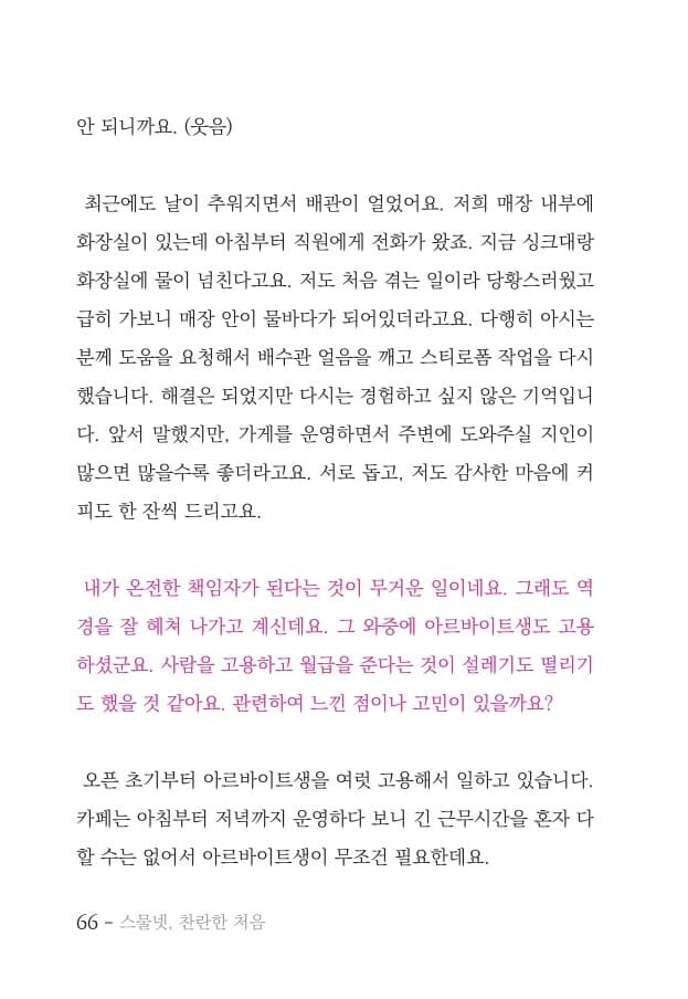 창업 초기에는 기계 관리가 서툴러 머신, 제빙기, 믹서기 등 여러 물건이 고장 났어요. 아르바이트생일 때에는 사장님께 말씀드려 해결했는데, 이제는 제가 해결해야 했죠. A/S 접수부터 상황 설명, 시간을 정해 수리하는 것까지요. 손님에게 수리 전까지 ‘믹서기가 고장 나서 블랜디드 종류는 안 된다.’, ‘커피 머신이 고장 나서 커피 종류는 안 된다.’ 등 한 분 한 분 설명드리는 것도 죄송스럽고 민망했어요.-창업|카페 사장님 연진 (p.65)