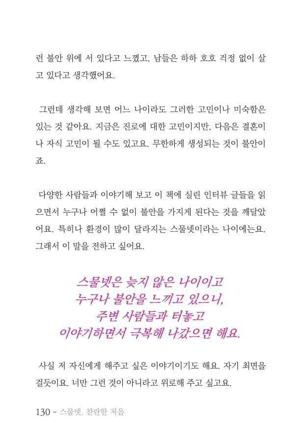 스물넷은 무엇인가를 시작하며 아직 어려워하고 서툴어하는 나이인 것 같아요. 어려움을 자주 맞닥뜨리고, 원하는 것을 다 이뤘더라도 새로운 고민이 생기기도 하고요. 저는 처음에 저 자신만 그런 불안 위에 서 있다고 느꼈고, 남들은 하하 호호 걱정 없이 살고 있다고 생각했어요. 그런데 생각해 보면 어느 나이라도 그러한 고민이나 미숙함은 있는 것 같아요. 지금은 진로에 대한 고민이지만, 다음은 결혼이나 자식 고민이 될 수도 있고요. 무한하게 생성되는 것이 불안이죠.-불안|아나운서 윤지 (p.130)