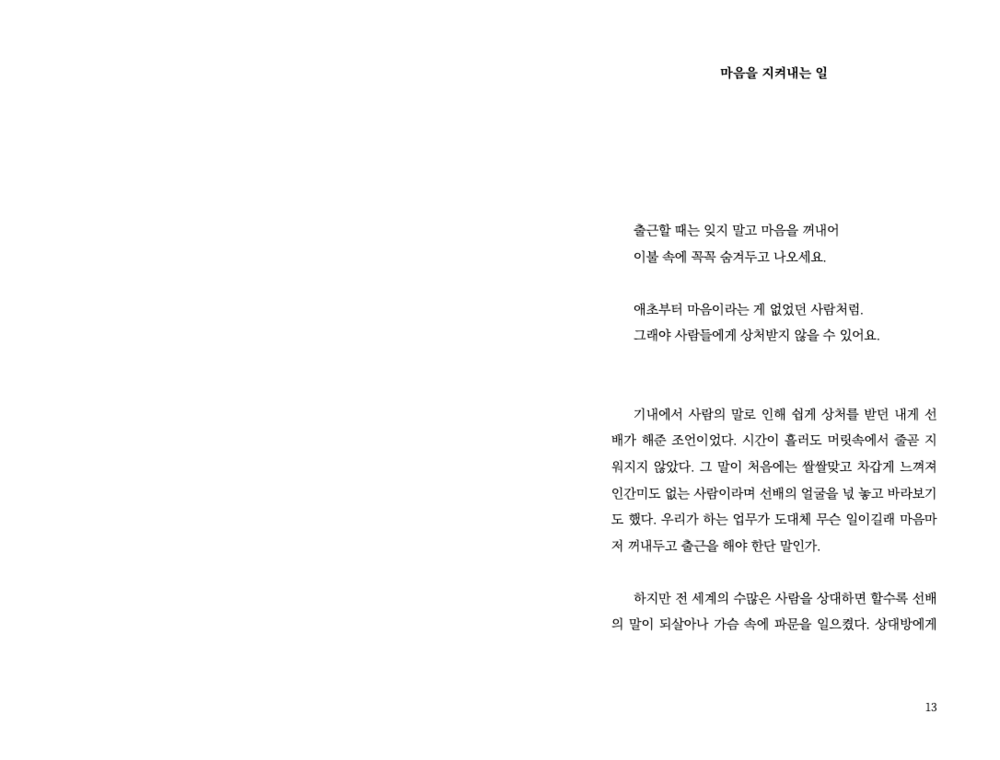 애초부터 마음이라는 게 없었던 사람처럼. 그래야 사람들에게 상처받지 않을 수 있어요. 13p