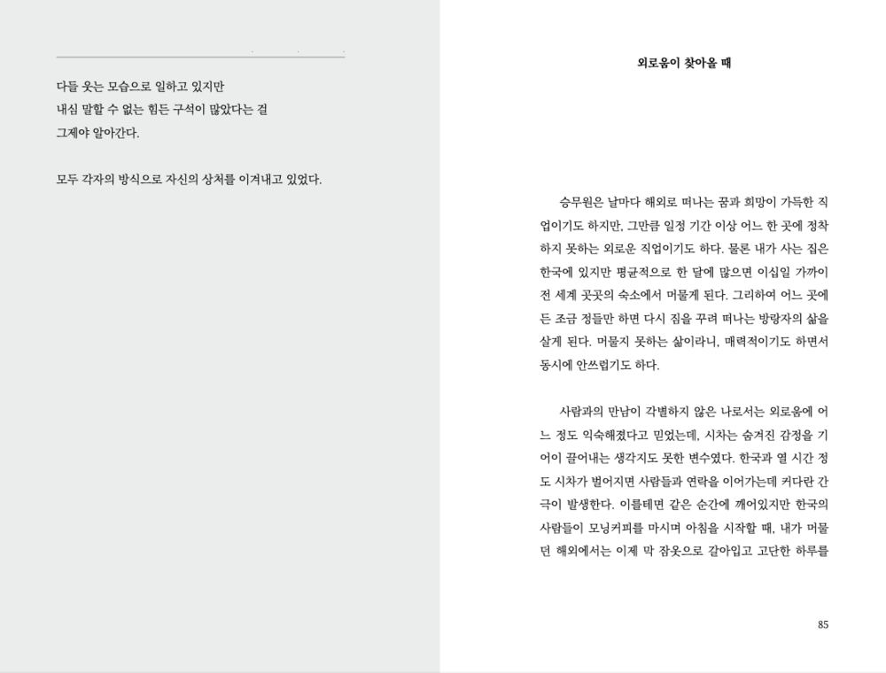 작가는 이번 책을 통해 항공기 승무원이라는 본업과, 작가라는 오랜 꿈 사이에서 중심을 잃지 않으려는 내면의 방황을 꾸밈없이 솔직하게 풀어낸다.