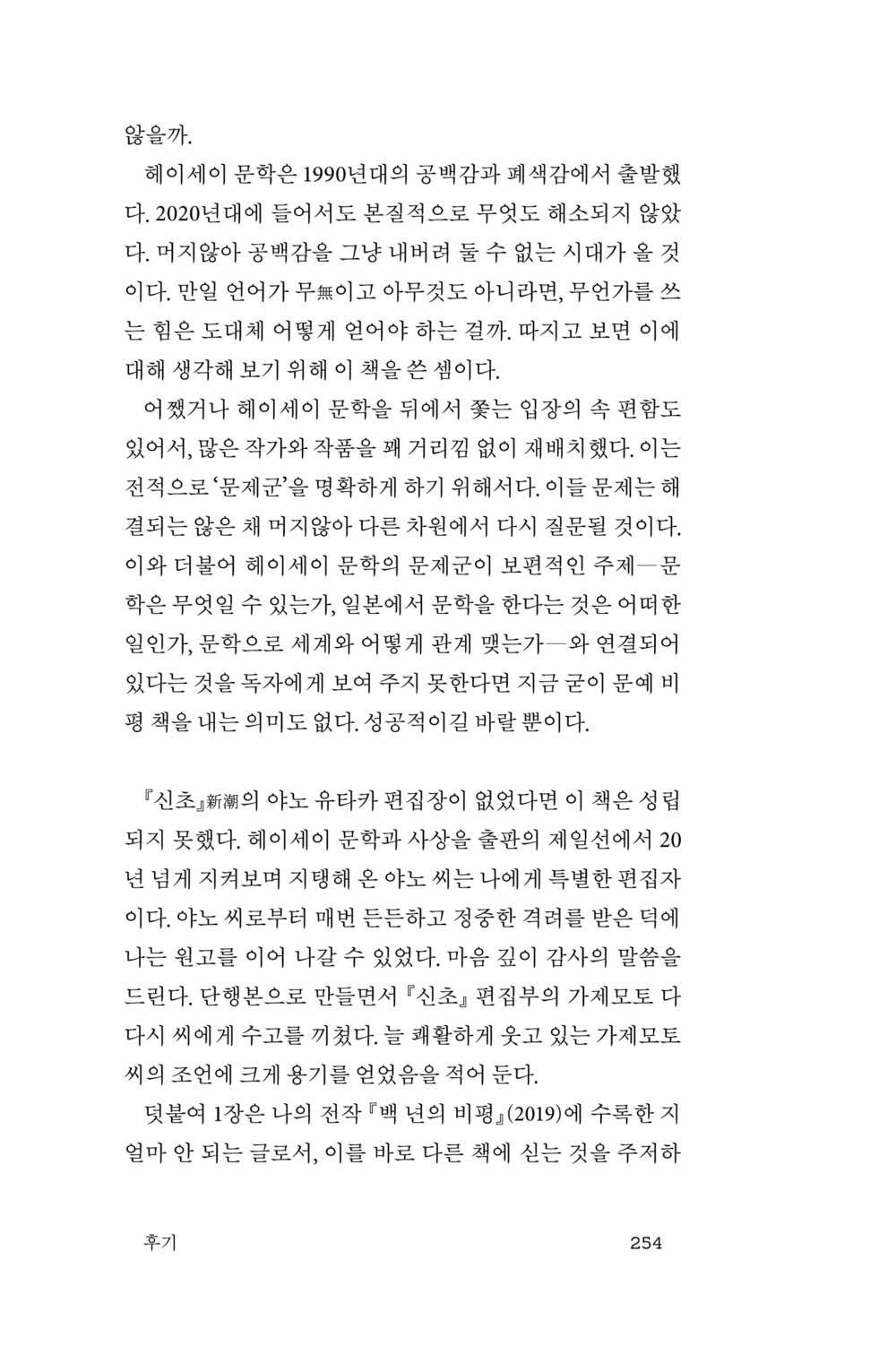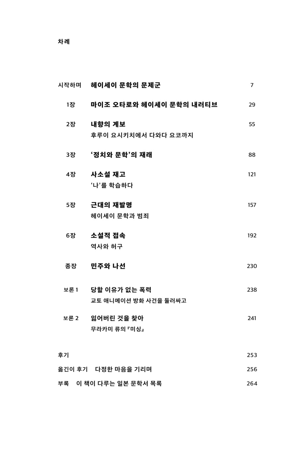 급변하는 세계가 만들어 낸 나선형 운동에 끝없이 포획되면서도 이탈을 꾀했던 헤이세이 문학의 유산을 올바르게 상속하고 문학의 진지를 다시 세우려는 비평적 노력이 우리 자신의 과제 또한 일깨운다.
