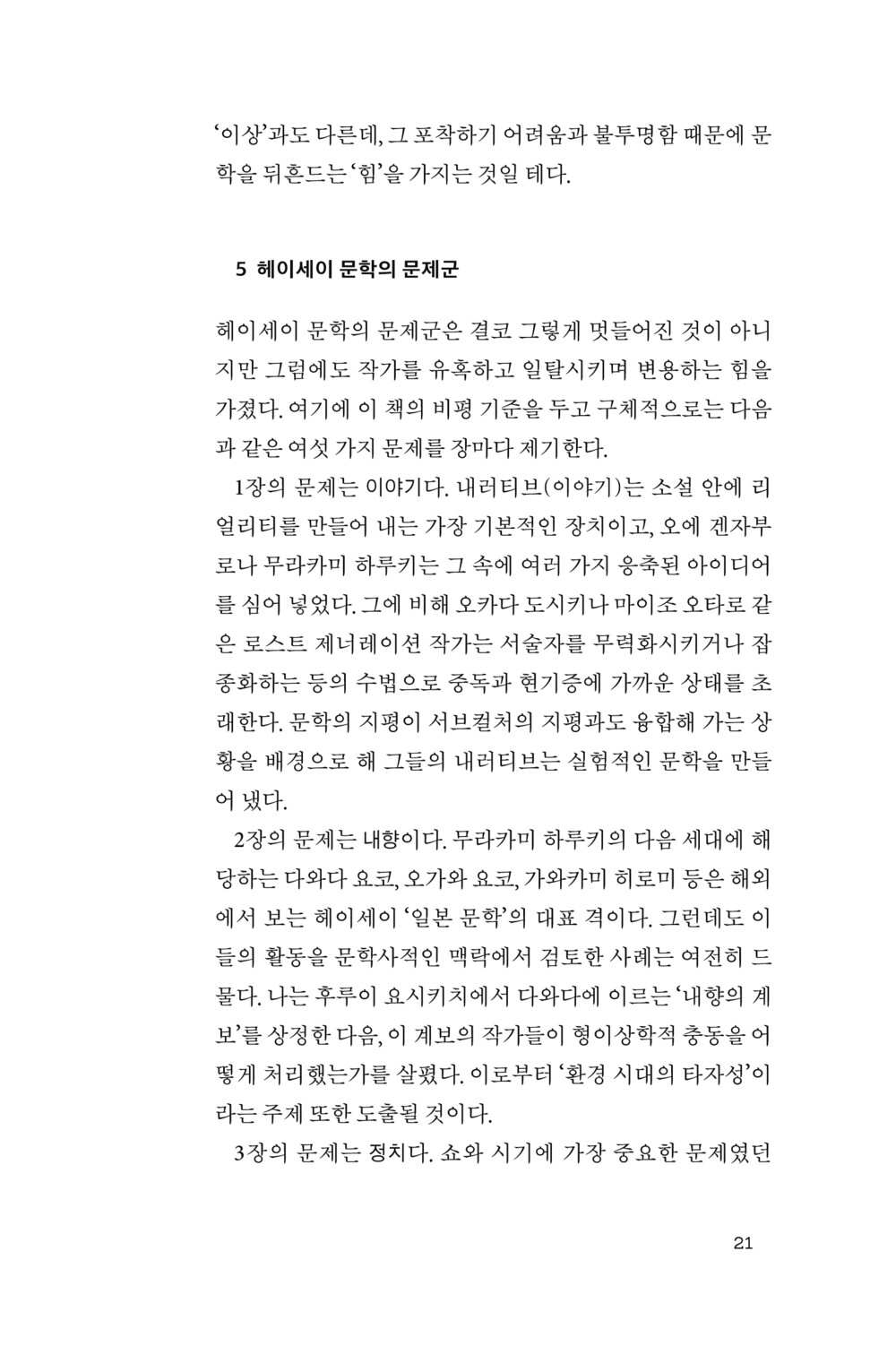 결론부터 말하면 나는 문학의 중심적 기능이란 ‘문제군’의 제시라고 보고, 한편 그 문제군을 복원하는 것이 헤이세이 문학을 비평하는 열쇠라고 생각했다. 그 ‘문제’들이 원래부터 작가의 눈앞에 나타나 있던 것은 아니다. 내가 말하고 싶은 것은 어디까지나 사후적으로 관찰했을 때 뿔뿔이 흩어져서 작업했을 터인 작가들이 특정한 주제에 대한 대응 방식에서 잠정적으로 합류하는 듯이 보인다는 점이다.
