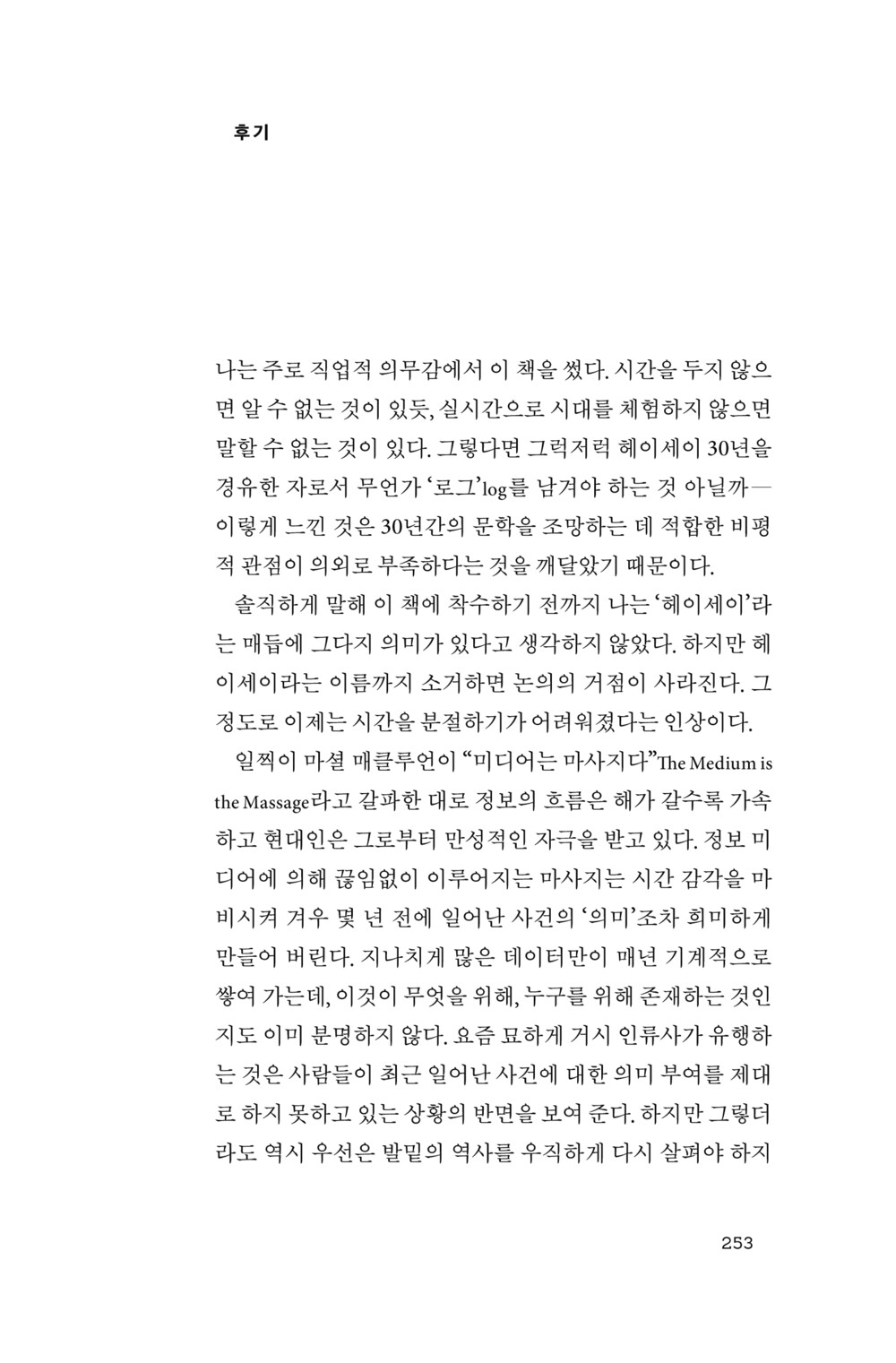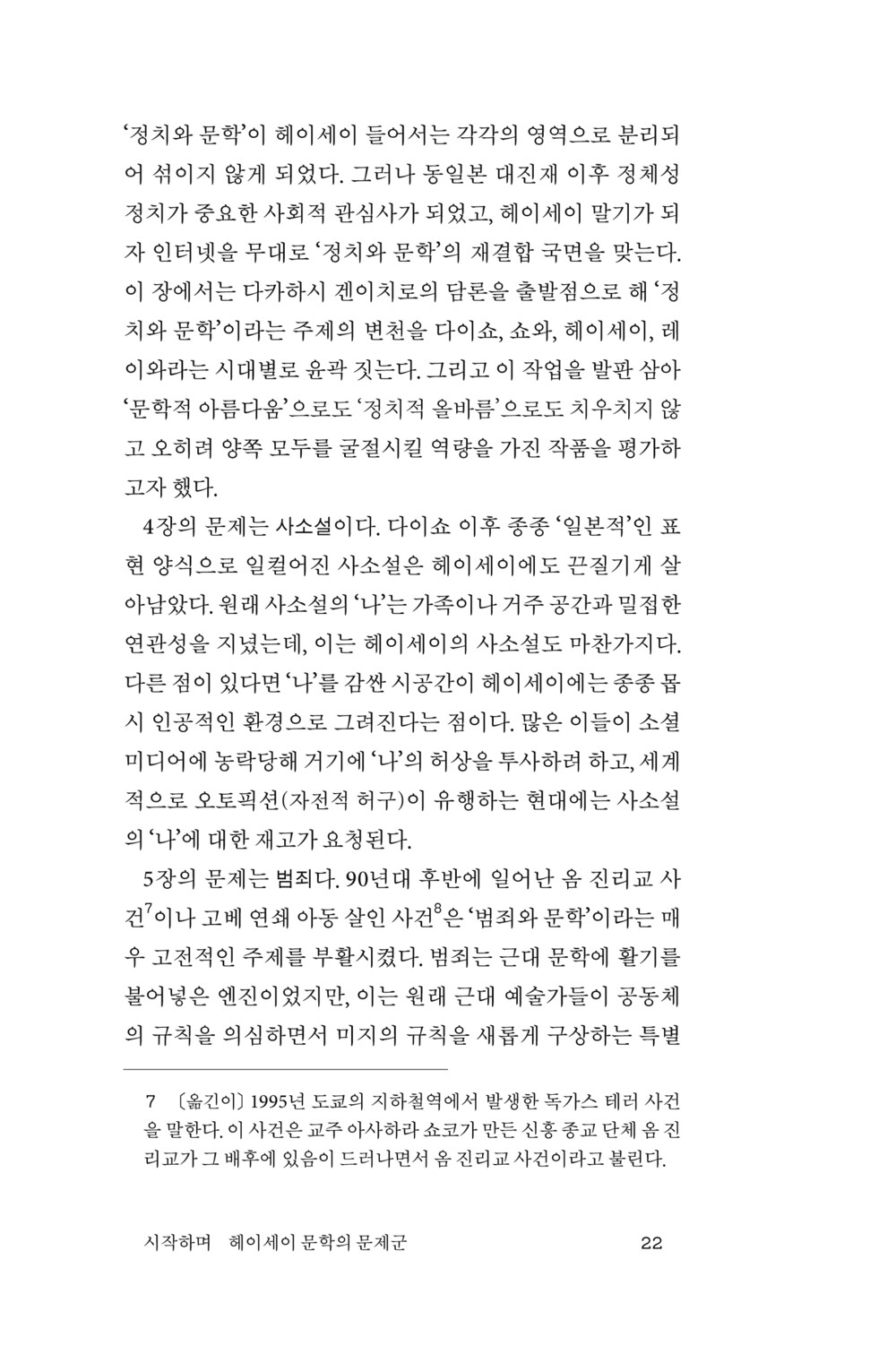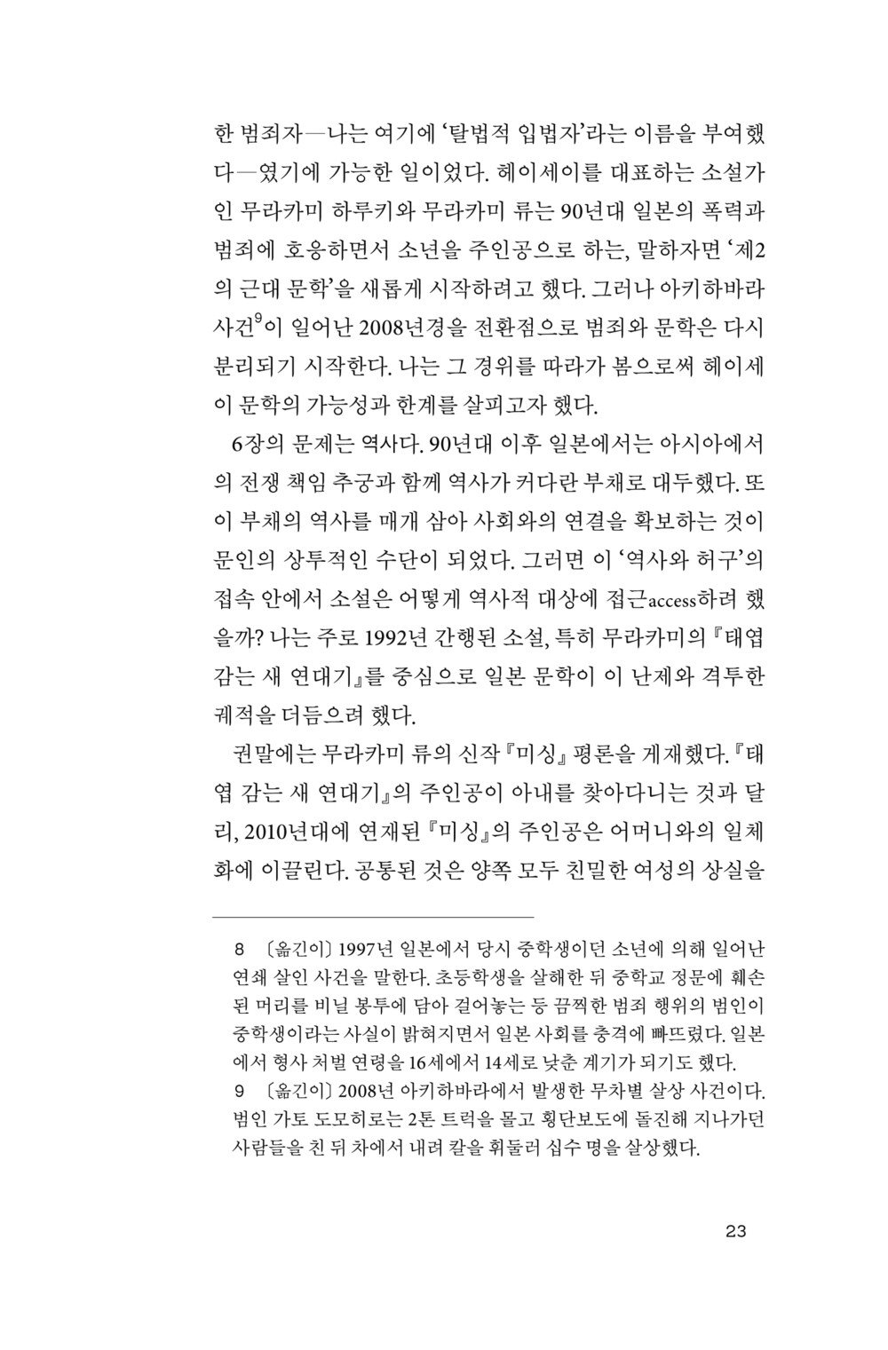 여기서 범죄와 역사라는 문제군을 둘러싼 쟁점을 모두 소개할 수는 없지만, 헤이세이 역사가 보여 준 실제 결과가 ‘문학의 패배’를 뜻하더라도 그 패배로부터 승계할 유산을 찾는 데 비평의 역할이 있다는 메시지를 재확인할 수 있다.
