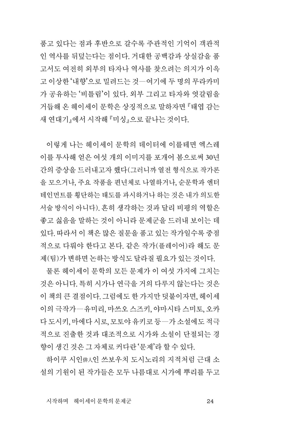 헤이세이는 냉전의 종식, 장기 불황의 시작, 소셜 미디어의 출현 등 일본 안팎에서 사회상의 급변이 일어난 시기와 포개진다. 이 시기 일본 문학에서는 세계화의 흐름을 타고서 무라카미 하루키, 다와다 요코, 무라타 사야카 등의 해외 진출이 이루어졌다. 반면 일본 국내로 시선을 돌리면 출판 시장의 급속한 위축과 주도적 문화로서 위상을 잃은 문학의 현재를 발견하게 된다. 이 확장과 수축의 양극적 운동은 문학의 내용과 현장에도 근본적인 변화를 가져올 수밖에 없었다.