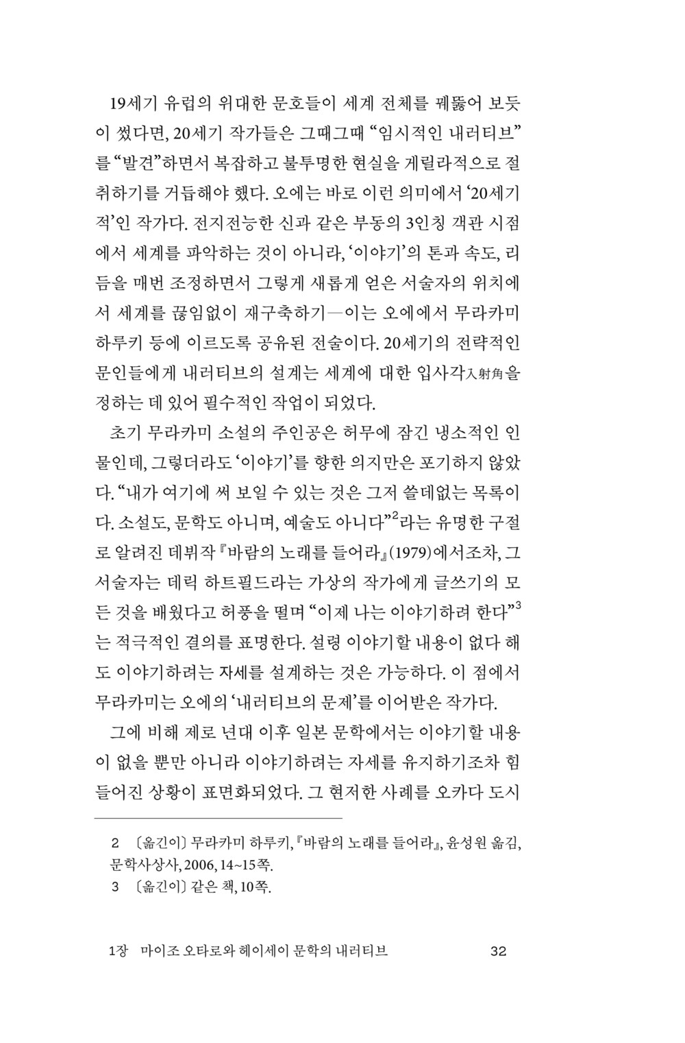 또 냉전 종식과 함께 분출한 일본의 전쟁 책임과 역사 인식 문제(재역사화)가 한편으로는 역사 수정주의를 포함하는 탈역사화의 반동을 가져왔음을 지적한 후, 헤이세이 문학이 전반적으로 역사의 문제에 응답할 준비가 되어 있지 못했던 가운데 『태엽 감는 새 연대기』가 우화적 방식으로 책임 인식에 이르는 길을 내려 도전한 “가치 있는 실패작”이었음도 세심히 짚는다.