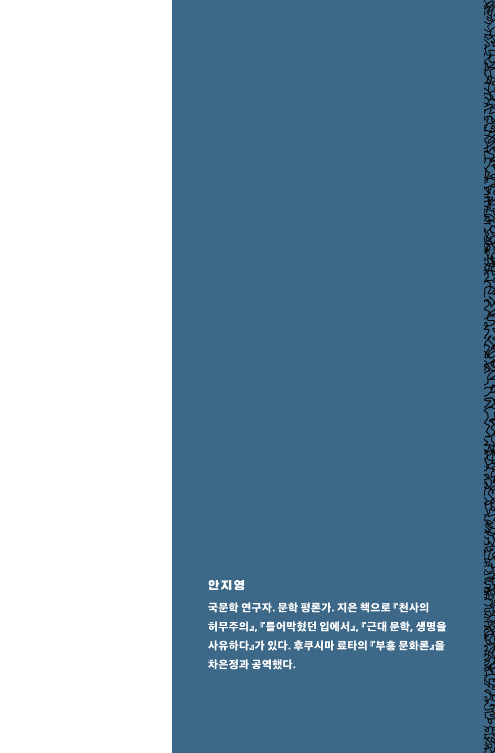 문학이 설 자리를 잃어 가는 현실은 일본만의 문제가 아니다. 문학의 존재 이유 자체가 위태롭게 여겨지는 이 시기에 “위대함과 아름다움을 잃은 황야에서도 문학은 여전히 질문을 던질 수 있다”고 역설하는 이 책은, 글을 쓰고 읽는 데서 중요한 가치를 찾는 모든 사람에게 용기를 북돋아 줄 수 있을 것이다.
