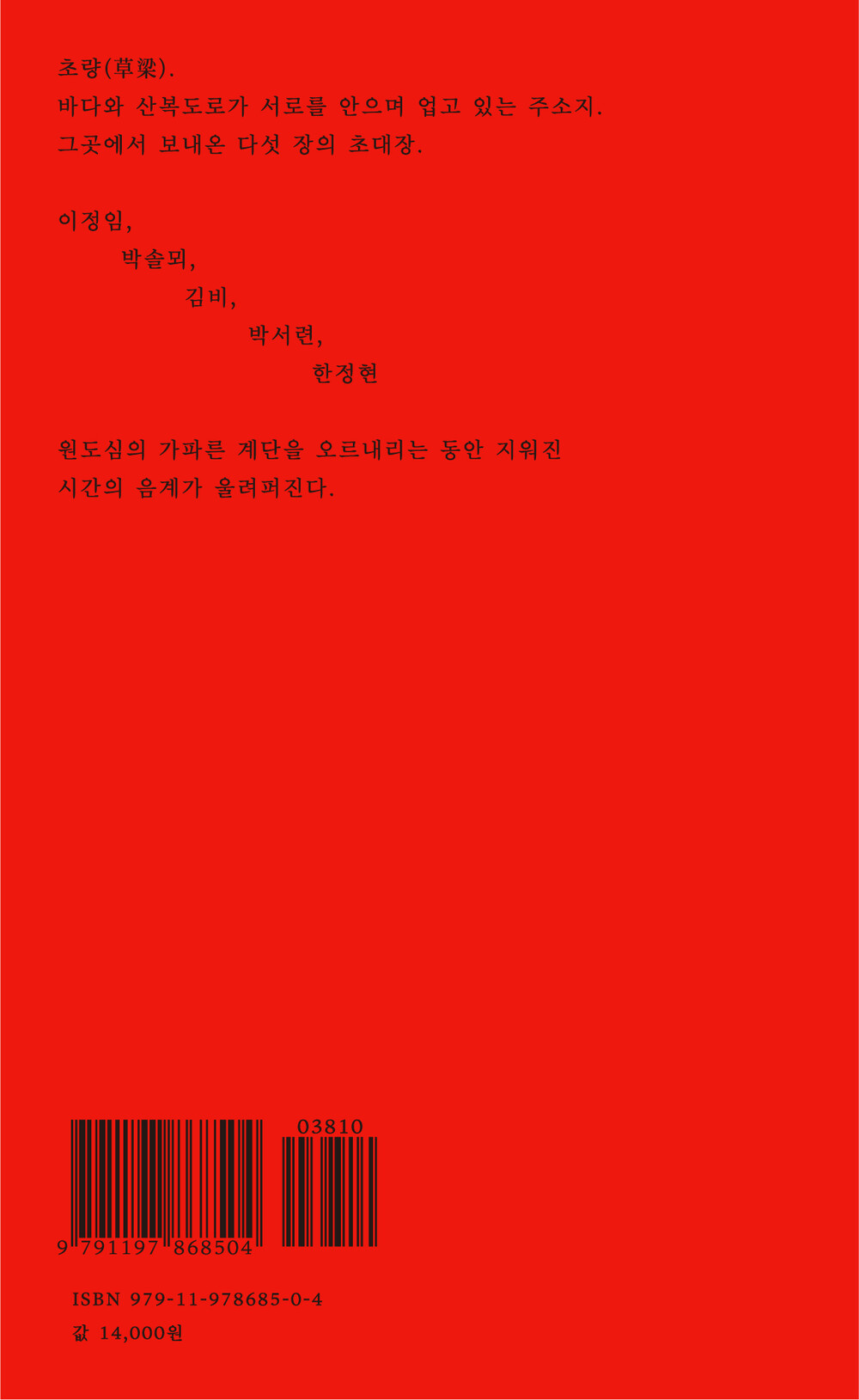 한국문학장에서 다른 문학적 지형도를 그려온 이정임, 박솔뫼, 김비, 박서련, 한정현은 행정 구역으로 표기하기 어려운 부산 초량의 곳곳을 각자의 방식으로 걸으며, 감각하고, 상상하며, 썼다.