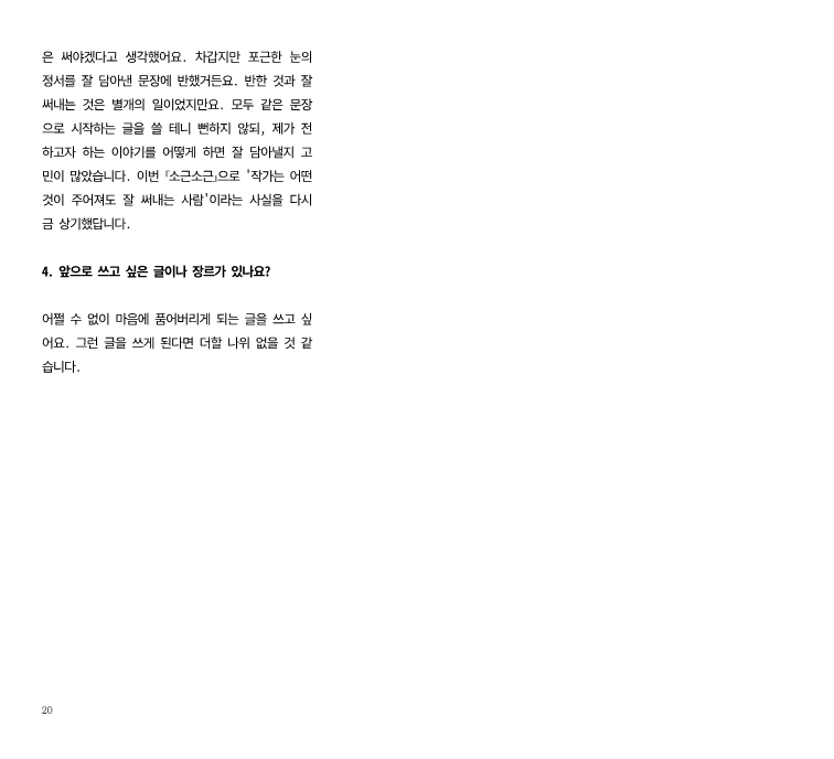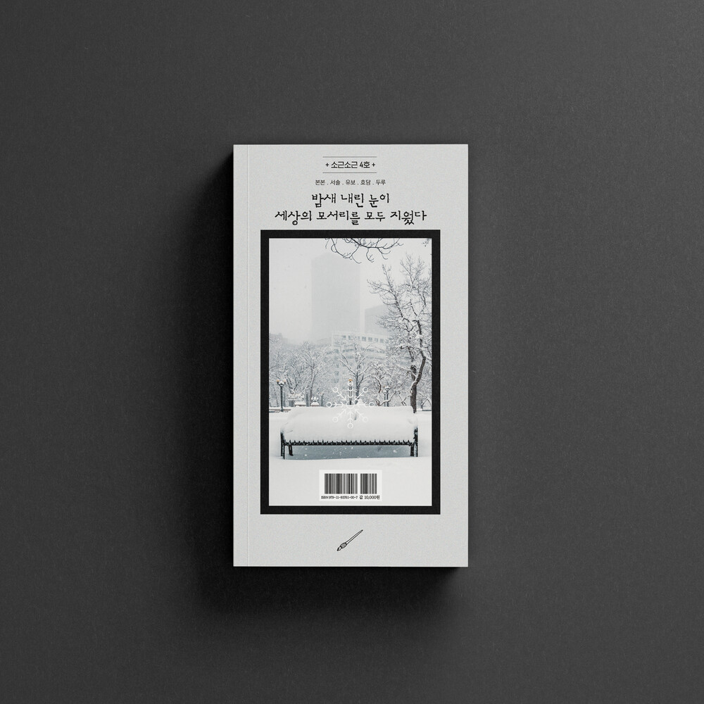 소근소근은 소박하고 근사한 책을 의미하며, 같은 문장으로 시작하는 다섯 작가의 수필을 담았다. 이번 문장은 '밤새 내린 눈이 세상의 모서리를 모두 지웠다'이며, 겨울에 어울리는 작가 다섯이 참여했다. 모두 시를 쓰거나, 시를 좋아하거나, 시와 같은 사람들이다. 그들은 하얀 눈 내린 풍경에서 세어나온 까만 틈을 보는 사람들이다. 소복히 쌓인 눈 아래 담긴 짙은 이야기는 남은 겨울에 겨울을 더해준다.