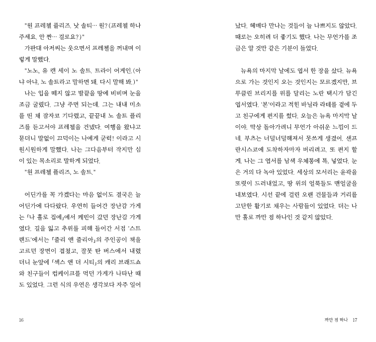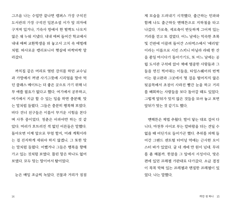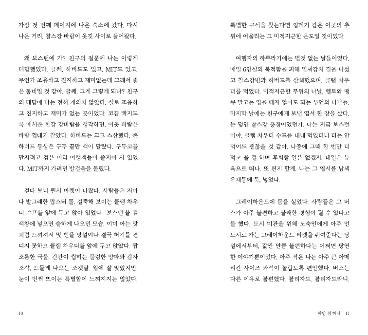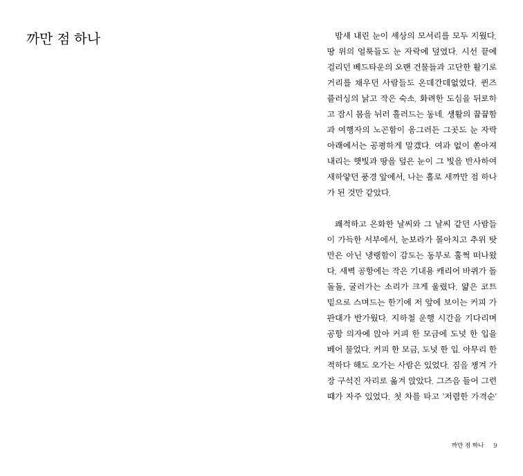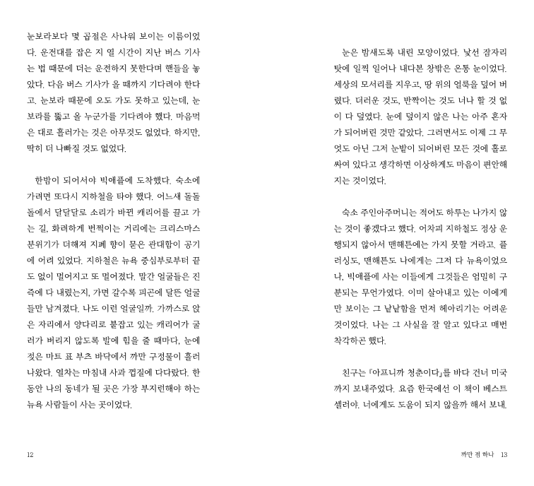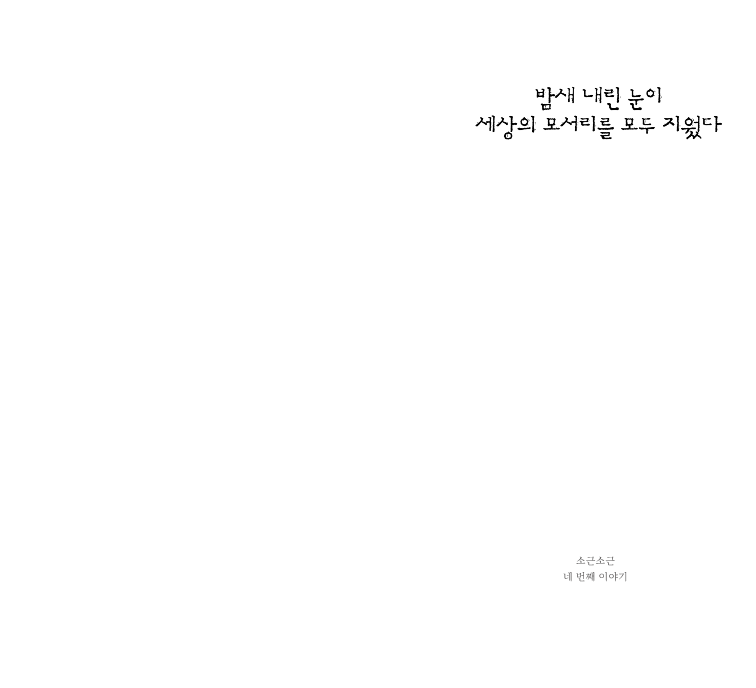 눈은 밤새도록 내린 모양이었다. 낯선 잠자리 탓에 일찍 일어나 내다본 창밖은 온통 눈이었다. 세상의 모서리를 지우고, 땅 위의 얼룩을 덮어 버렸다. 더러운 것도, 반짝이는 것도 너나 할 것 없이 다 덮였다. 눈에 덮이지 않은 나는 아주 혼자가 되어버린 것만 같았다. 그러면서도 이제 그 무엇도 아닌 그저 눈밭이 되어버린 모든 것에 홀로 싸여 있다고 생각하면 이상하게도 마음이 편안해지는 것이었다.