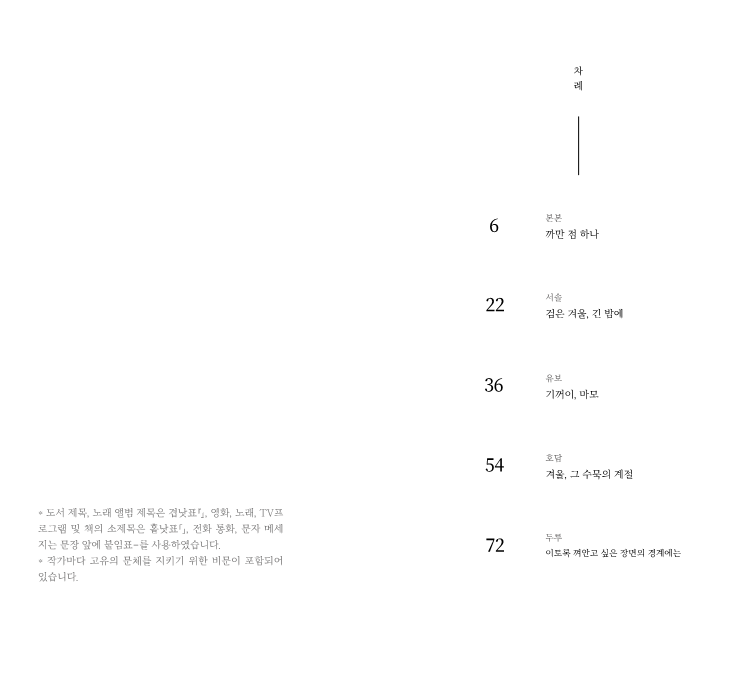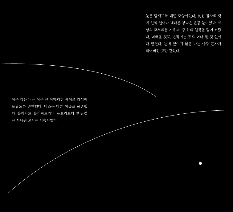 움츠러든 몸이 동그랗게 말릴 때, 밖으로 내어놓기 부끄러운 것들이 심장에 가 닿는 것을 느낀다. 감추려던 것들이 목전에 와닿을 때면 깊이 뿌리내린 것들은 자신의 의지만으로 쉽사리 외면할 수 없음을 깨닫는다.'감출수록 마주하게 된다는 것'과 '눈 내리는 겨울' 이 두 가지가 겹칠 때면 지나는 여러 발자국 아래로 슬픔이 묻어난다. 하염없이 쏟아지는 눈길을 걷던 이들은 무엇을 감추고 싶었던 걸까. 창밖으로는 눈이 계속이다. 아직 감추는데 서투른 이들을 토닥이듯, 미처 시작하지 못한 이들에게 손짓하듯 좀처럼 잦아들 기미가 없다.