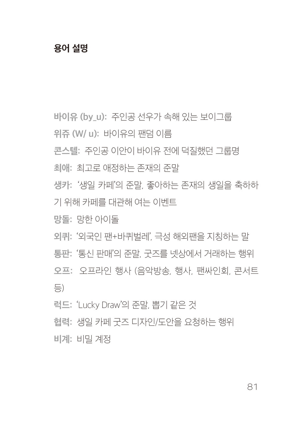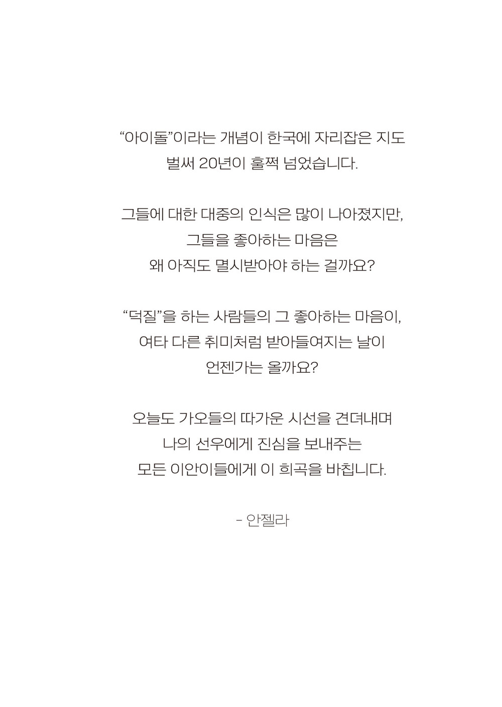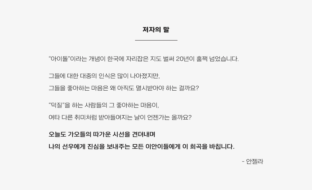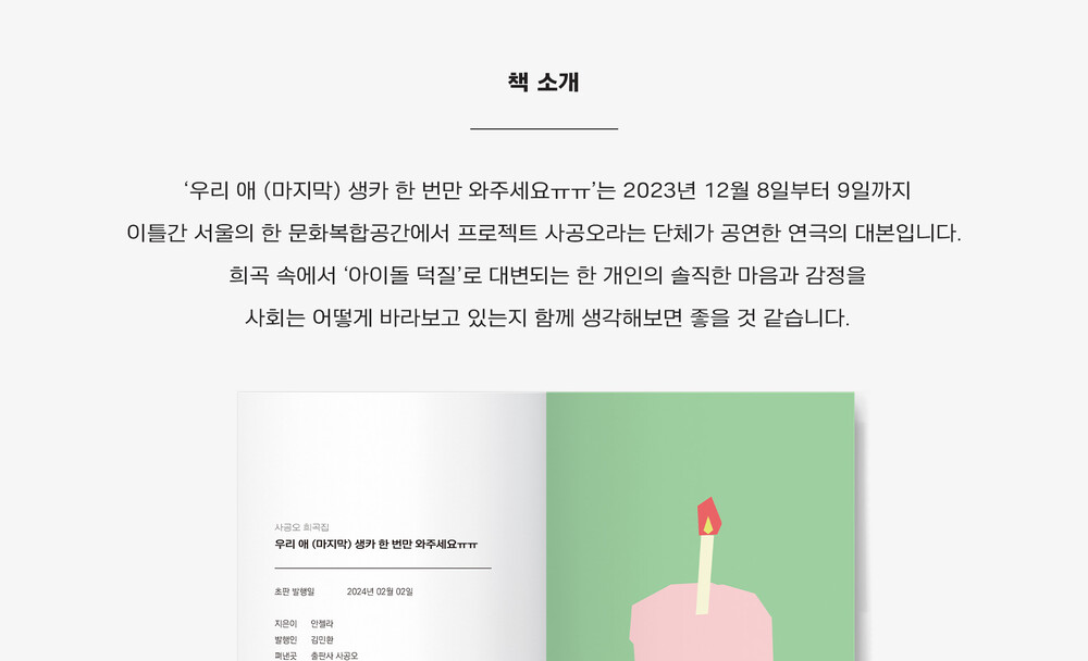 희곡 속에서 ‘아이돌 덕질’로 대변되는 한 개인의 솔직한 마음과 감정을 사회는 어떻게 바라보고 있는지 함께 생각해보면 좋을 것 같습니다.