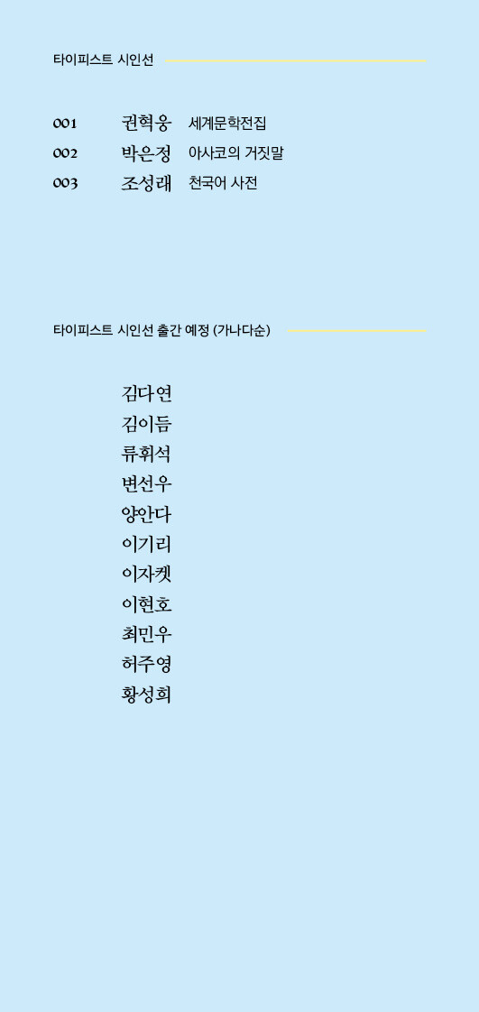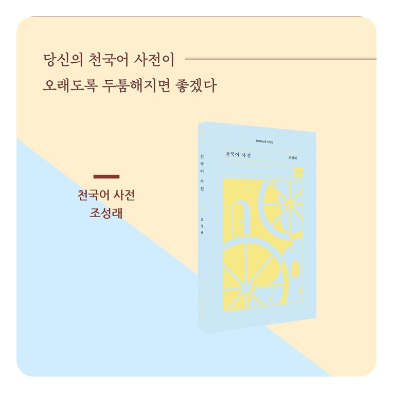 2022년 문학사상 신인상을 수상하며 활동을 시작한 조성래 시인의 첫 시집 『천국어 사전』이 타이피스트 시인선 003번으로 출간되었다. 데뷔 당시 이문재, 이수명 시인으로부터 “자기 언어를 다루는 솜씨에도 기교를 넘치지 않게 조절하는 힘이 있다”는 평을 받은 바 있는 조성래 시인은 이 시대 젊은이들의 삶과 상처들을 핍진하게 그려내는 동시에 결핍과 죽음으로 점철된 자전적 이야기들로 서정시의 새로운 계보를 기대하게 한다.