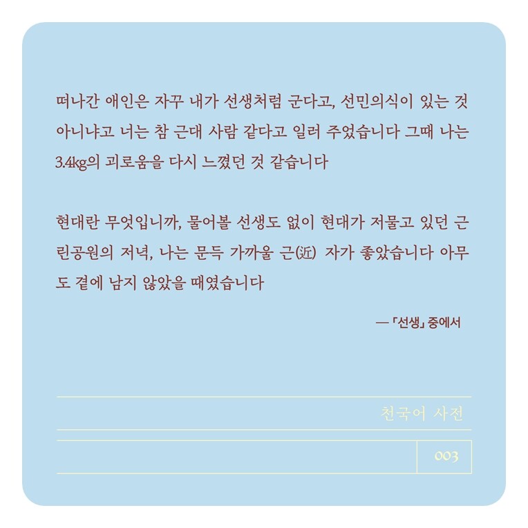 떠나간 애인은 자꾸 내가 선생처럼 군다고, 선민의식이 있는 것 아니냐고 너는 참 근대 사람 같다고 일러 주었습니다 그때 나는 3.4kg의 괴로움을 다시 느꼈던 것 같습니다