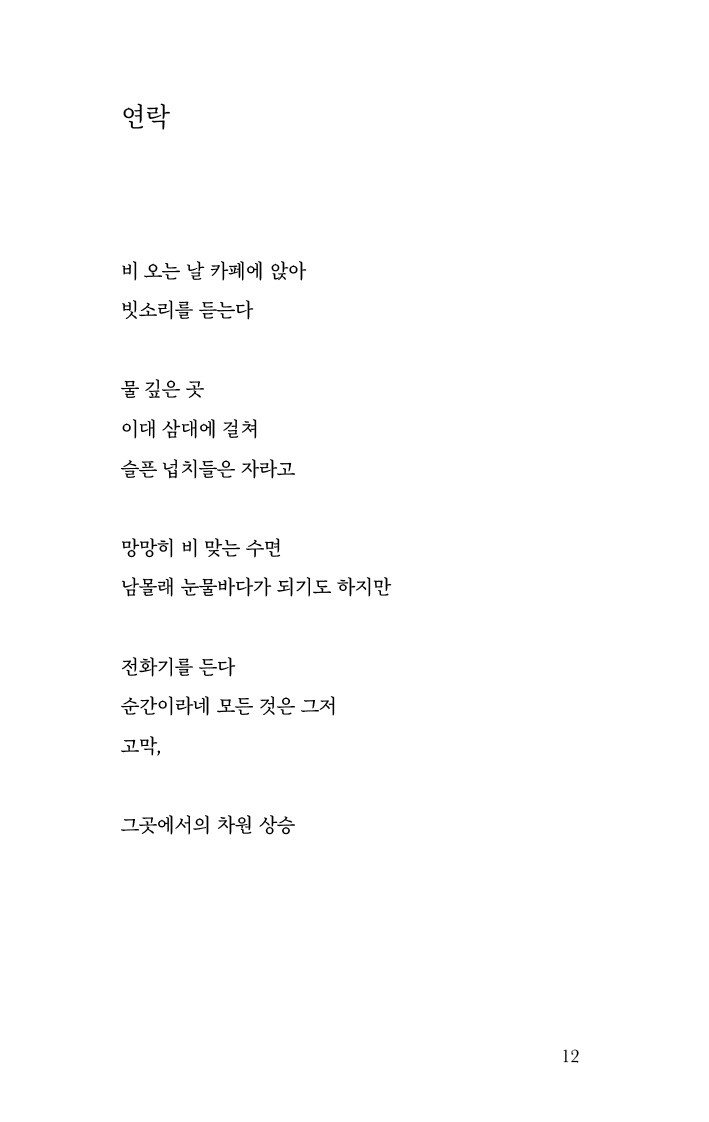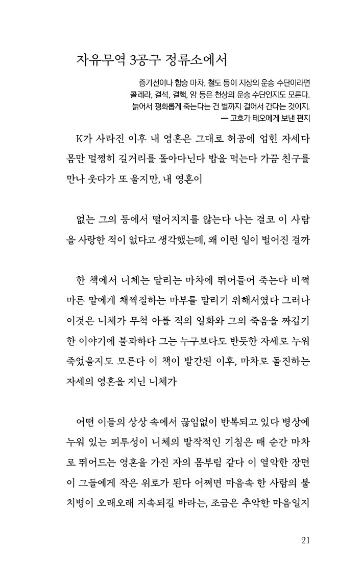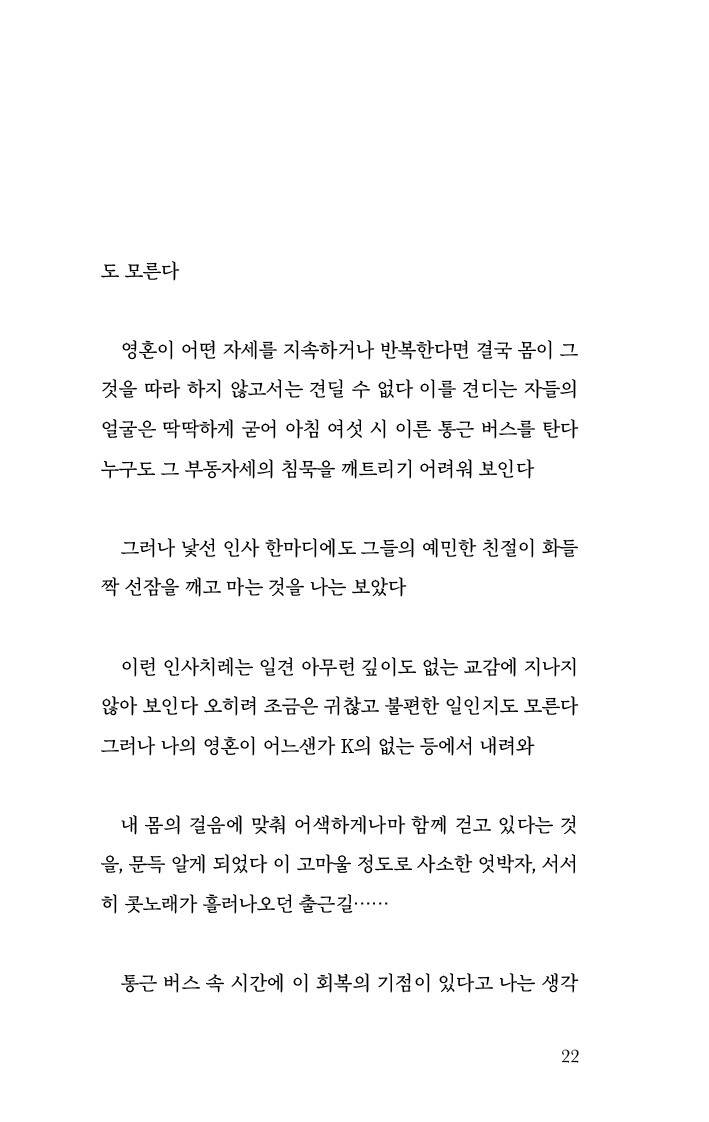 K가 사라진 이후 내 영혼은 그대로 허공에 업힌 자세다 몸만 멀쩡히 길거리를 돌아다닌다 밥을 먹는다 가끔 친구를 만나 웃다가 또 울지만, 내 영혼이