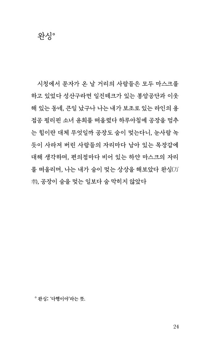시청에서 문자가 온 날 거리의 사람들은 모두 마스크를 하고 있었다 성산구라면 일진테크가 있는 봉암공단과 이웃해 있는 동네, 큰일났구나 나는 내가 보조로 있는 라인의 용접공 필리핀 소녀 윤희를 떠올렸다 하루아침에 공장을 멈추는 힘이란 대체 무엇일까