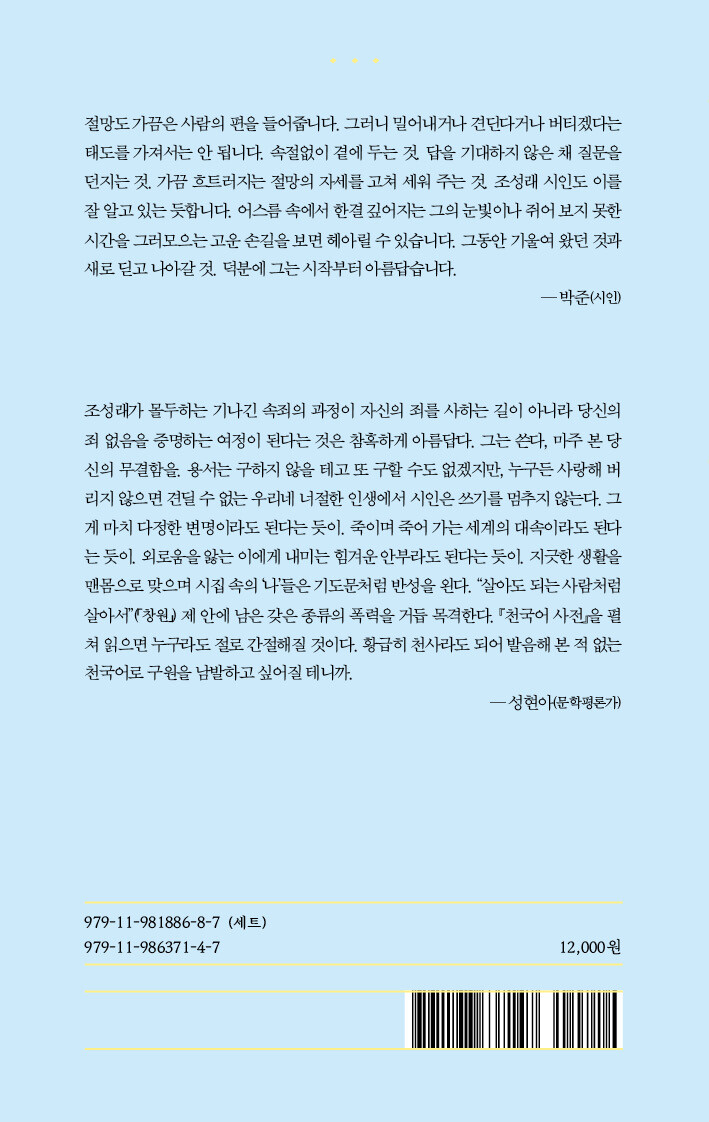 조성래가 몰두하는 기나긴 속죄의 과정이 자신의 죄를 사하는 길이 아니라 당신의 죄 없음을 증명하는 여정이 된다는 것은 참혹하게 아름답다. 그는 쓴다, 마주 본 당신의 무결함을. 용서는 구하지 않을 테고 또 구할 수도 없겠지만, 누구든 사랑해 버리지 않으면 견딜 수 없는 우리네 너절한 인생에서 시인은 쓰기를 멈추지 않는다. 그게 마치 다정한 변명이라도 된다는 듯이. 죽이며 죽어 가는 세계의 대속이라도 된다는 듯이. 외로움을 앓는 이에게 내미는 힘겨운 안부라도 된다는 듯이. 지긋한 생활을 맨몸으로 맞으며 시집 속의 ‘나’들은 기도문처럼 반성을 왼다. “살아도 되는 사람처럼 살아서”(「창원」) 제 안에 남은 갖은 종류의 폭력을 거듭 목격한다. 천국어 사전을 펼쳐 읽으면 누구라도 절로 간절해질 것이다. 황급히 천사라도 되어 발음해 본 적 없는 천국어로 구원을 남발하고 싶어질 테니까. ─ 성현아(문학평론가)