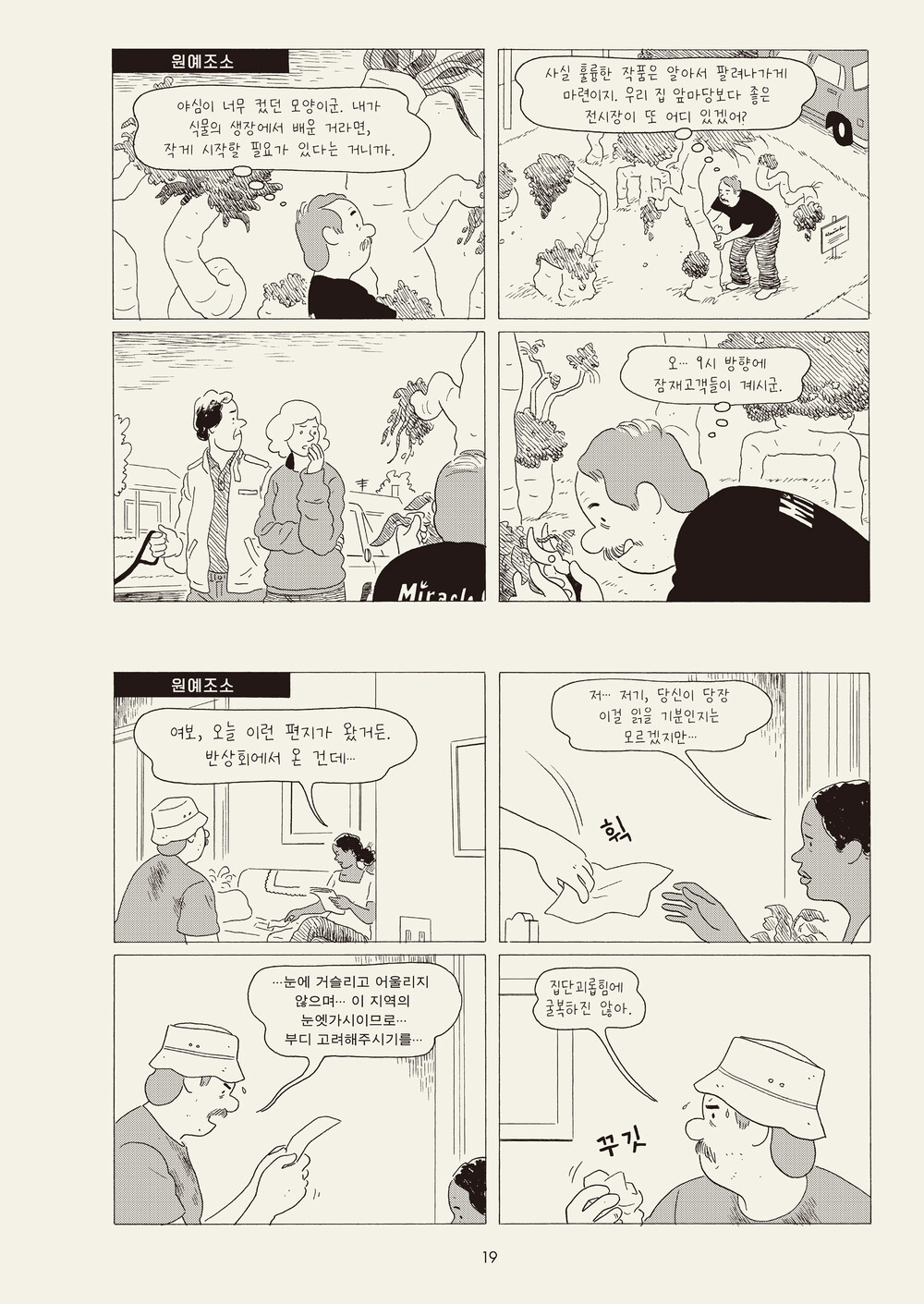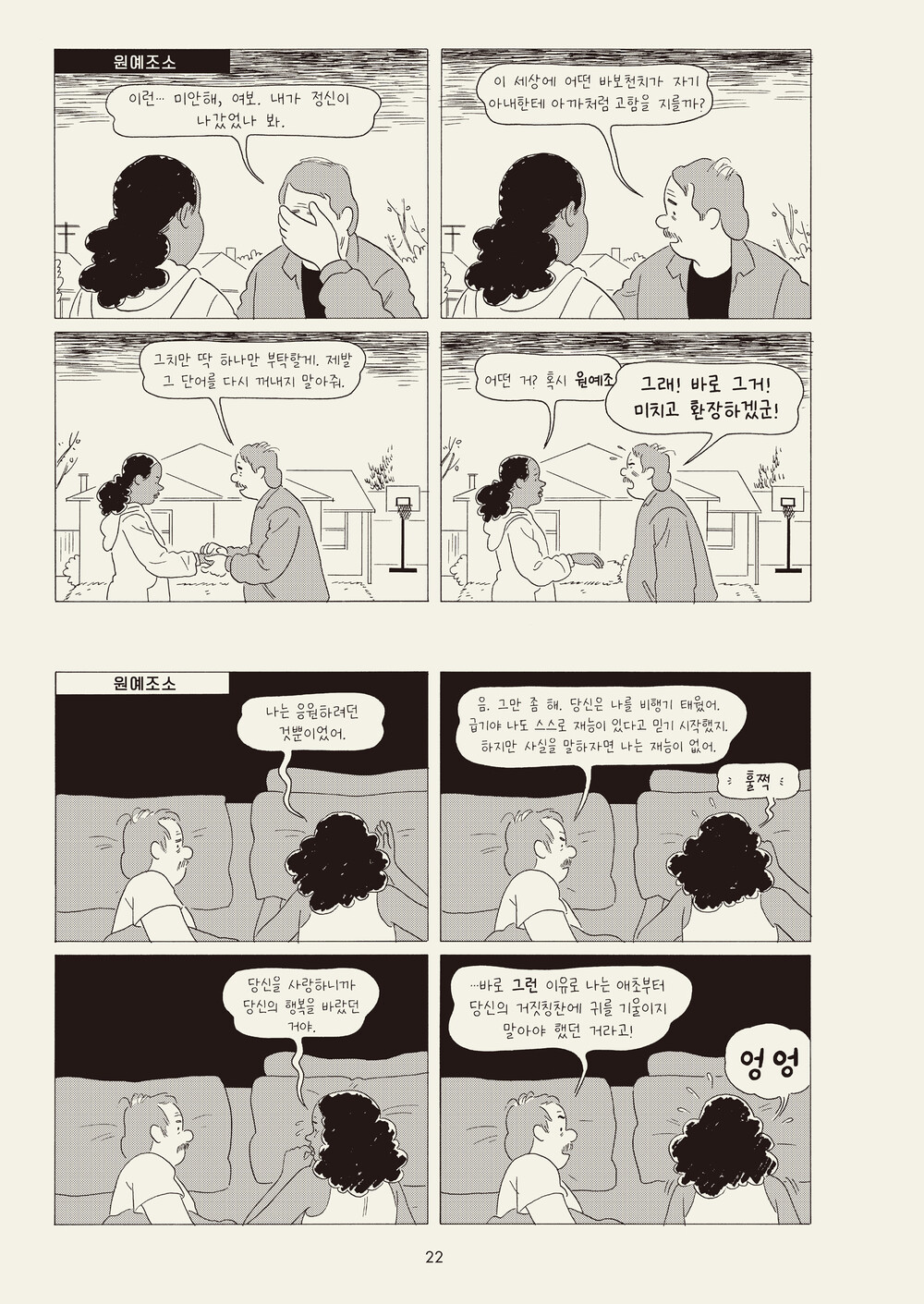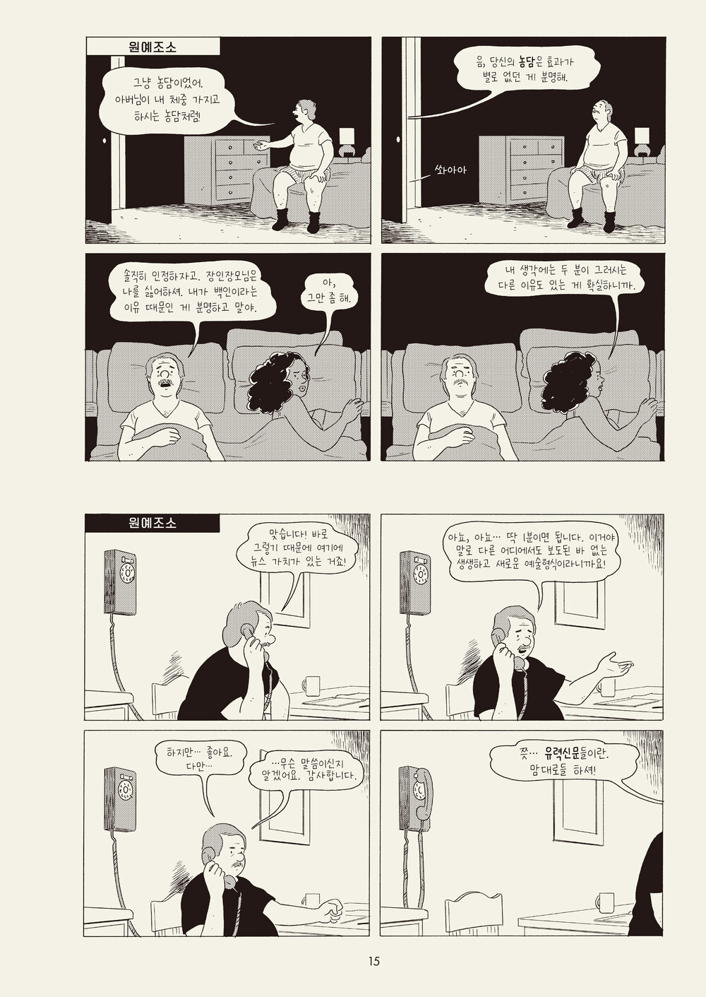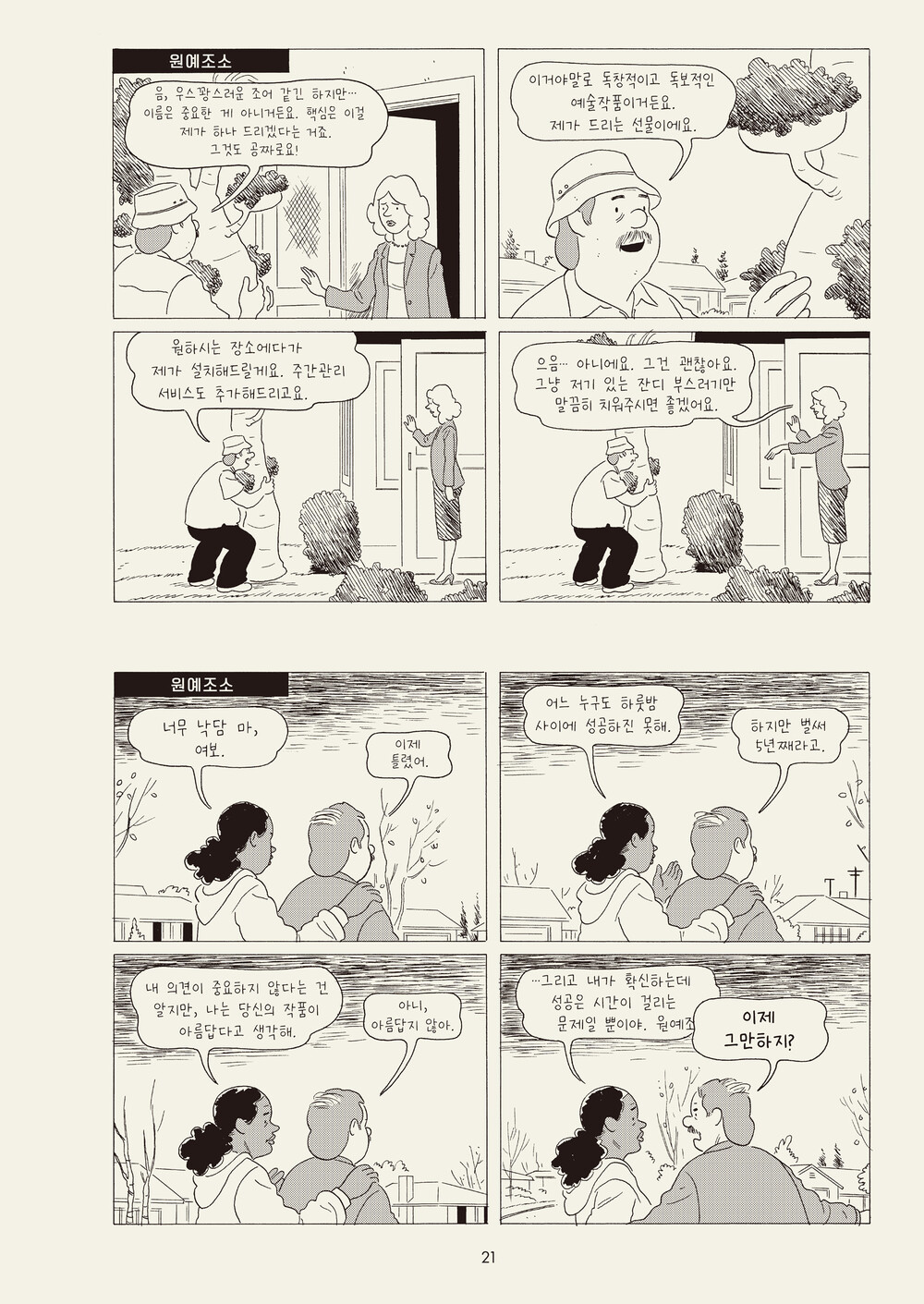 일본어에서 옮김 Translated, from the Japanese - 한 어머니가 자녀에게 보내는 편지에서 가족 간의 긴장과 각 구성원의 고립이 드러난다. 인물이 담기지 않은 스틸 이미지만이 줄 수 있는 뉘앙스와 덤덤한 캡션이 인상적인 작품. 킬링 앤 다잉 Killing and Dying - 시한부 어머니를 둔 10대 딸은 스탠드업코미디라는 장래희망을 발표한다. 죽여주는 농담을 개발하기 위해 노력하는 딸과 딸의 재능(과 그 밖의 모든 것)을 배워가려는 아빠의 모습이 눈물과 웃음을 동시에 준다.