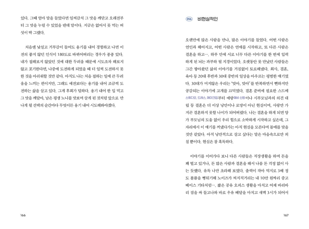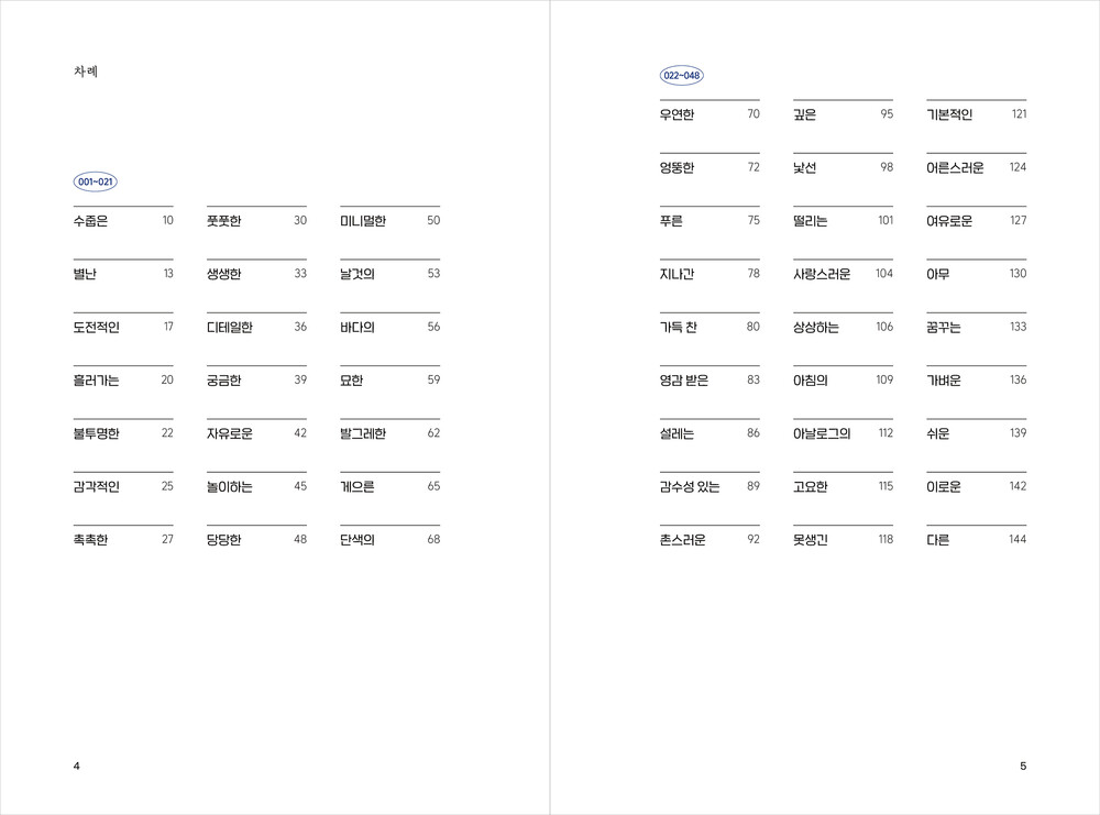 수줍은 / 별난 / 도전적인 / 흘러가는 / 불투명한 / 감각적인 / 촉촉한 / 풋풋한 / 생생한 / 디테일 한 / 궁금한 / 자유로운 / 놀이하는 / 당당한 / 미니멀한 / 날것의 / 바다의 / 묘한 / 발그레한 / 게으른 / 단색의 / 우연한 / 엉뚱한 / 푸른 / 지나간 / 가득 찬 / 영감 받은 / 설레는 / 감수성 있는 / 촌스러운 / 깊은 / 낯선 / 떨리는 / 사랑스러운 / 상상하는 / 아침의 / 아날로그의 / 고요한 / 못생긴 / 기본적인 / 어른스러운 / 여유로운 / 아무 / 꿈꾸는 / 가벼운 / 쉬운 / 이로운 / 다른 / 왜곡된 / 화창한 / 정돈된 / 개인적인 / 규율 있는 / 양면의 / 시도하는 / 비현실적인 / 전문적인 / 여행하는 / 총총한 / 쓸모 없는 / 시원한 / 순차적인 / 떨어지는 / 잠자는 / 돌아보는 / 진짜의 / 단단한 / 느린 / 열렬한 / 감사한 / 휘갈기는 / 나아가는 / 사람다운 / 이방인의 / 찰나의 / 우유부단한 / 배부른 / 쓸모 있는 / 관찰하는 / 독립된 / 평범한 / 생각하는 / 올바른 / 긴 / 갈증 나는 / 기록하는 / 캄캄한 / 또렷한 / 괜찮은 / 새로운 / 변수 있는 / 밤새운 / 자연의 / 과장된 / 시기 적절한 / 깜박이는 / 향기로운 / 쉬는 / 나은 / 끝없는