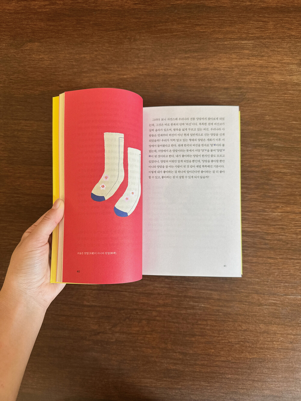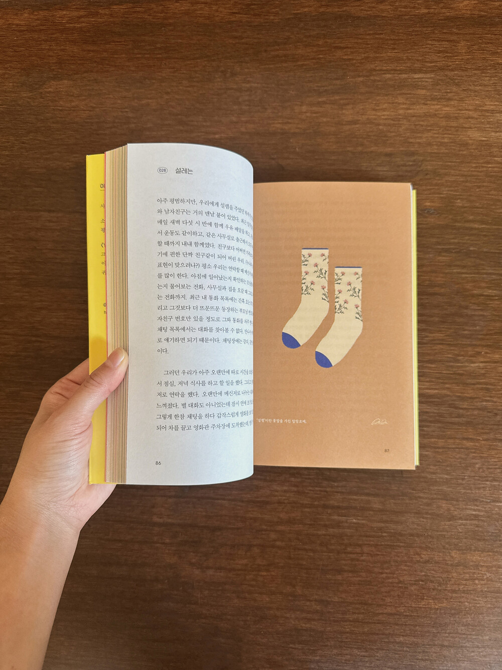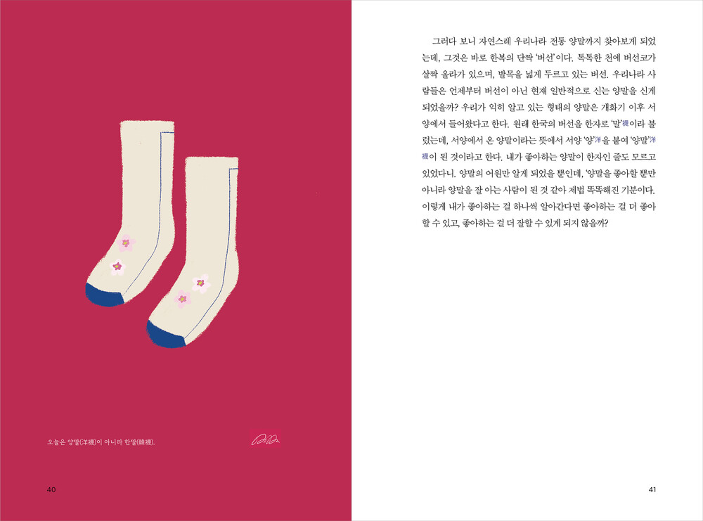 부끄러움이 많았던 저의 사적인 취향을 은은히 드러내는 방법은 ‘양말’이었습니다. 그날의 온도와 차림에 따라 플라워 패턴, 나일론 글리터, 시스루 스트라이프, 노르딕 니트 양말을 골랐습니다. 매일 아침, 발목을 보드랍게 감싸는 귀여운 양말을 신으면 하루의 시작이 행복해지곤 했습니다.