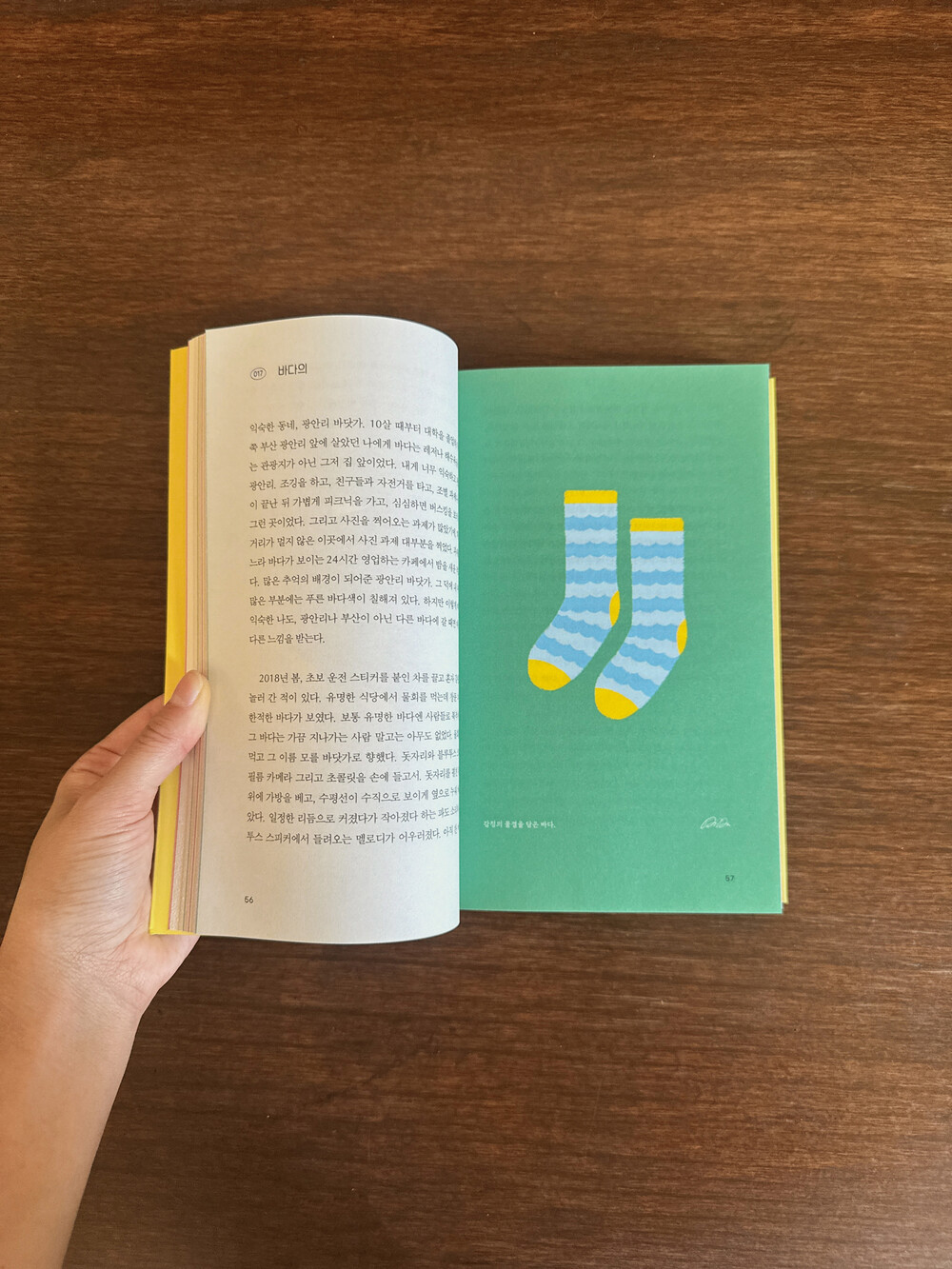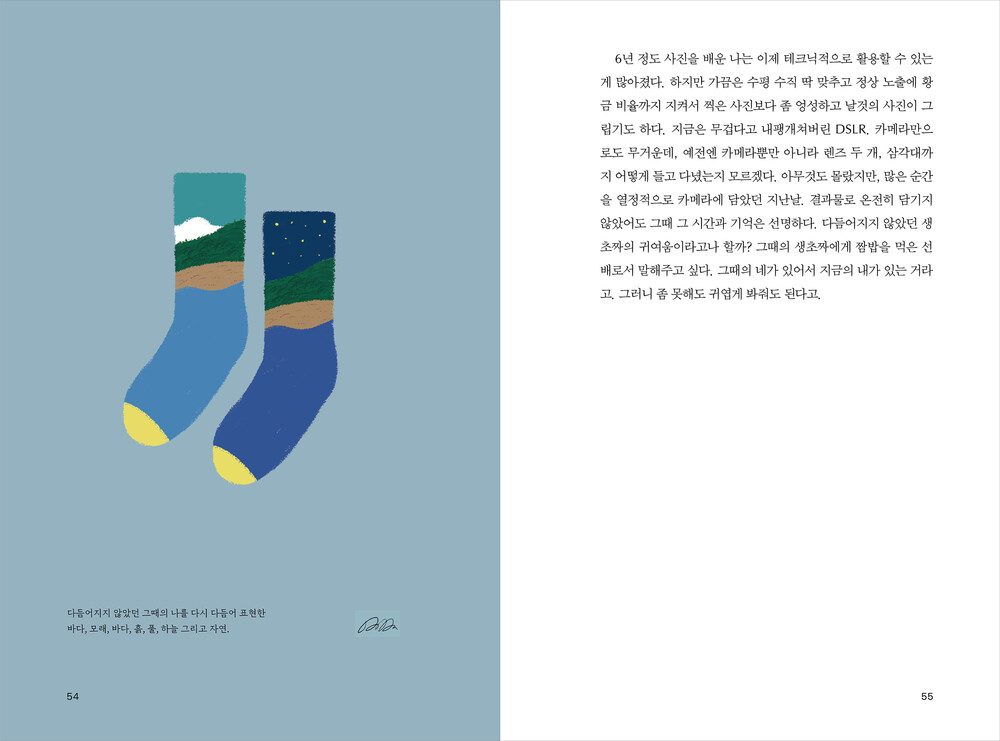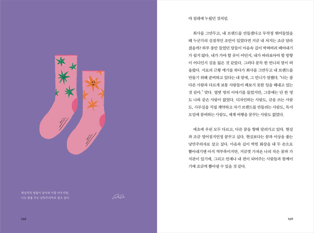 서랍장이 빼곡히 채워질 만큼 좋아하게 되었을 때, 양말을 도화지 삼아 100일 동안 하나의 낱말을 정해 글 한 편과 양말 한 켤레를 그렸습니다. 동 트기 전 새벽 우유 배달, 공유 사무실 살이, 헬로바이써니 브랜드를 만드는 과정까지. 쉽게 취향을 드러내지 못하던 사람에서 점점 다채롭게 성장해 나가는, 어쩌면 들키지 않고 싶을 만큼 솔직한 일기장입니다.