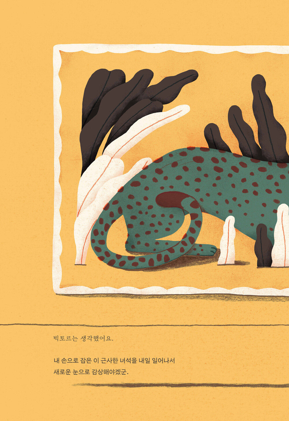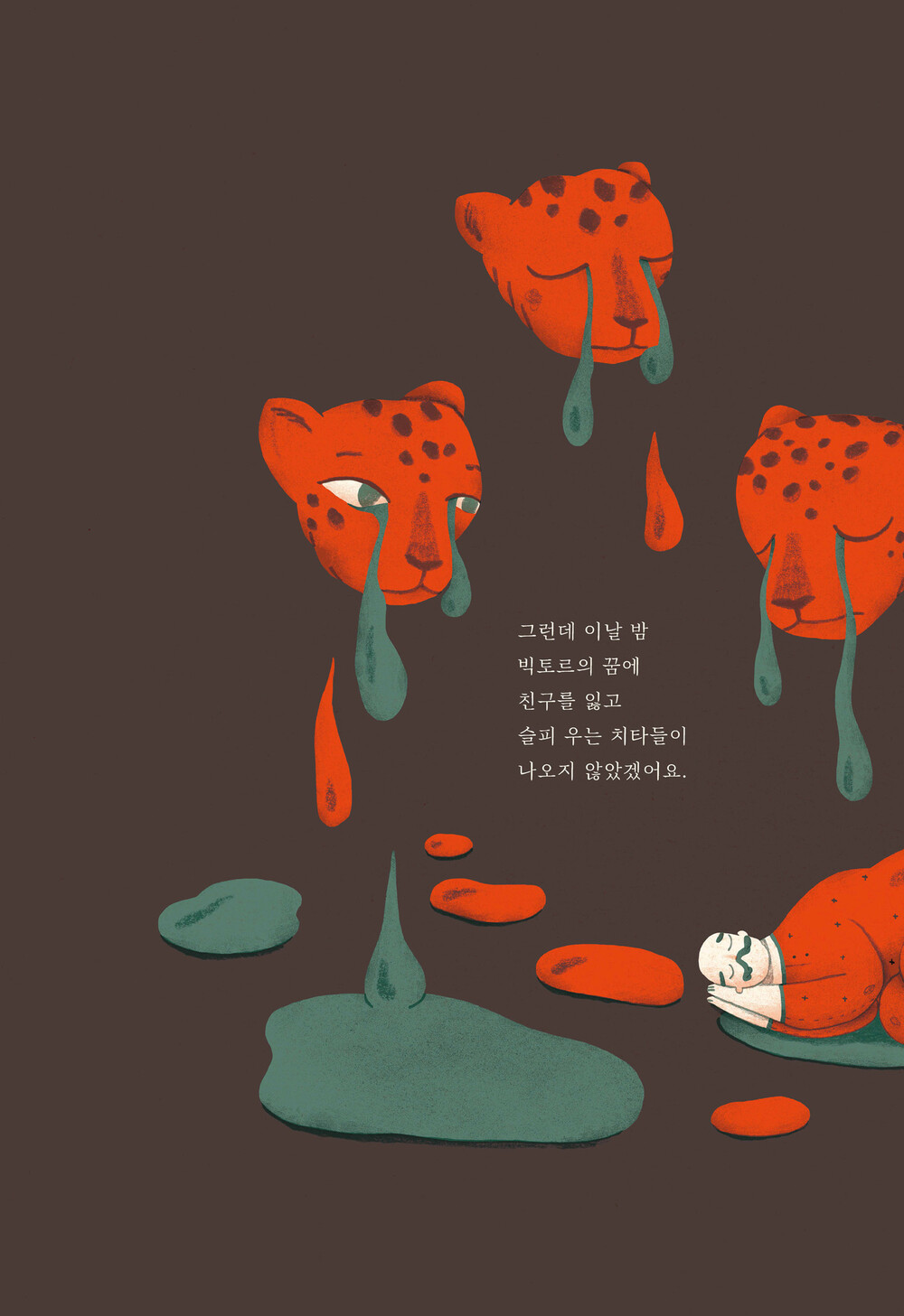 바로 옆 페이지에는 피 웅덩이 속 드러누운 치타 한 마리가 그려져 있다.