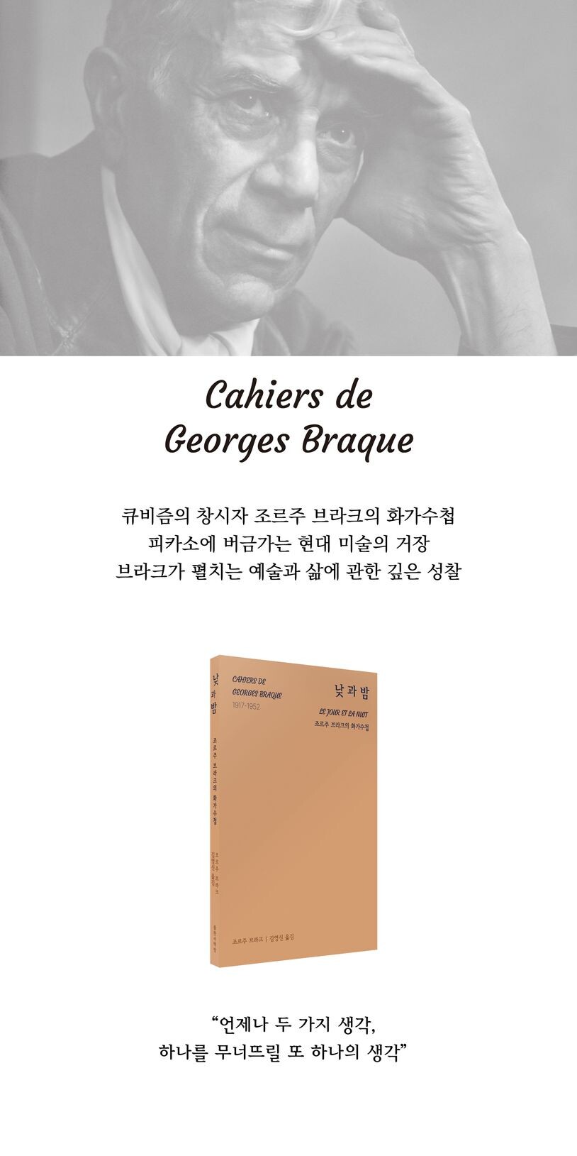〈낮과 밤〉은 조르주 브라크가 추구했던 예술적 사유와 철학적 깊이를 엿볼 수 있는 특별한 책이다. 독창적이고 예리한 통찰을 담은 브라크의 짧은 문장은 예술 그리고 삶에 대한 전망을 이야기한다. 브라크 예술의 비밀을 엿볼 수 있는 귀중한 자료로 브라크가 펼치는 빛과 어둠, 존재와 무, 삶과 죽음의 상징적 대비, 예술과 삶에 관한 깊은 성찰은 인간의 인식과 예술의 본질을 파고드는 치열한 기록이다. 또한 자연과 인간, 실재와 관념, 현실과 상상 등 우리의 세계관을 구성하는 대립 사이의 균형에 관한 철학적이고 미학적인 성찰은 예술과 삶의 본질을 탐구하려는 모든 이들에게 큰 영감을 줄 것이다.