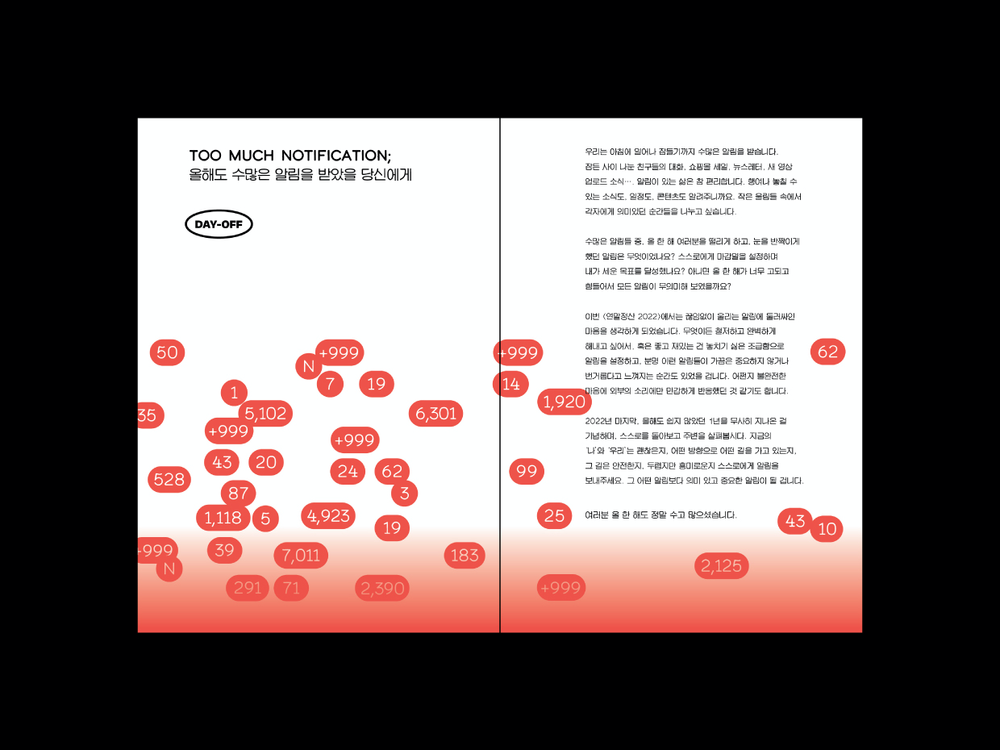 우리는 아침에 일어나 잠들기까지 수많은 알림을 받습니다. 잠든 사이 나눈 친구들의 대화, 쇼핑몰 세일, 뉴스레터, 새 영상 업로드 소식… 알림이 있는 삶은 참 편리합니다. 행여나 놓칠 수 있는 소식도 일정도 콘텐츠도 알려주니까요.올해 데이오프는 작은 울림들 속에서 각자에게 의미있던 순간들을 나누고 싶습니다.