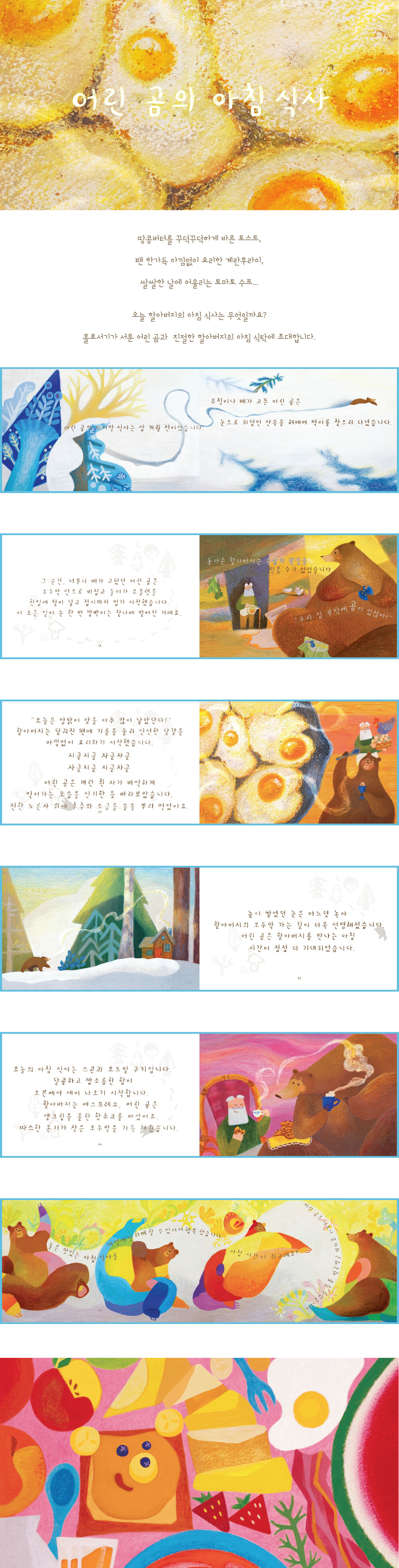 작가는 어린 시절에서부터 성인이 된 지금까지 꾸준히 받아온 한결같은 사랑을 어린 곰의 아침 식사에 녹여냈습니다.