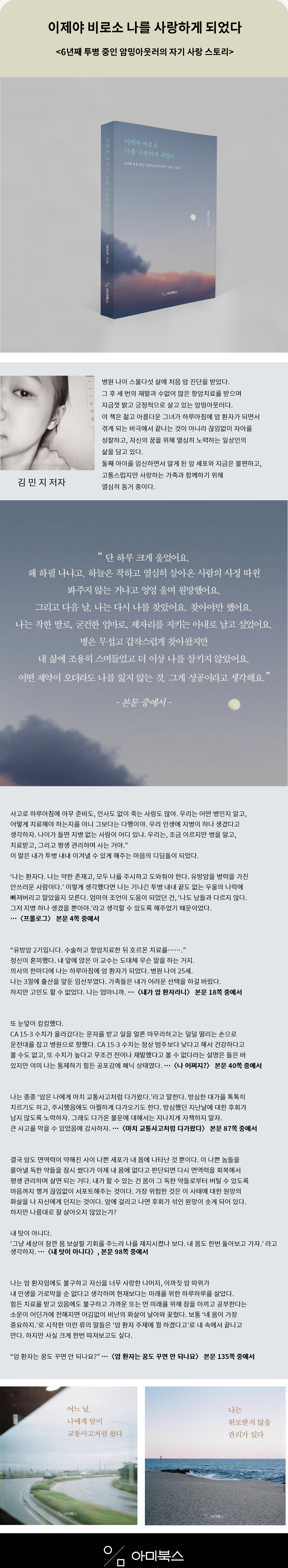 누군가는 암에 걸린 것이 세상이 끝난 것처럼 여기기도 하지만 《이제야 비로소 나를 사랑하게 되었다》의 저자는 치열한 투병 과정을 덤덤하게 기록하고, 자기 내면을 고찰하는 과정을 통해 암 환자도 일상을 잘 살 수 있음을 스스로 증명하고 있다.
