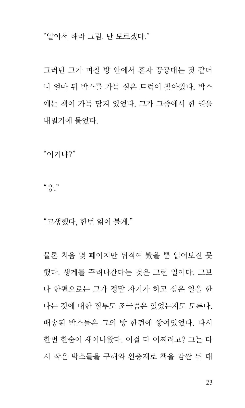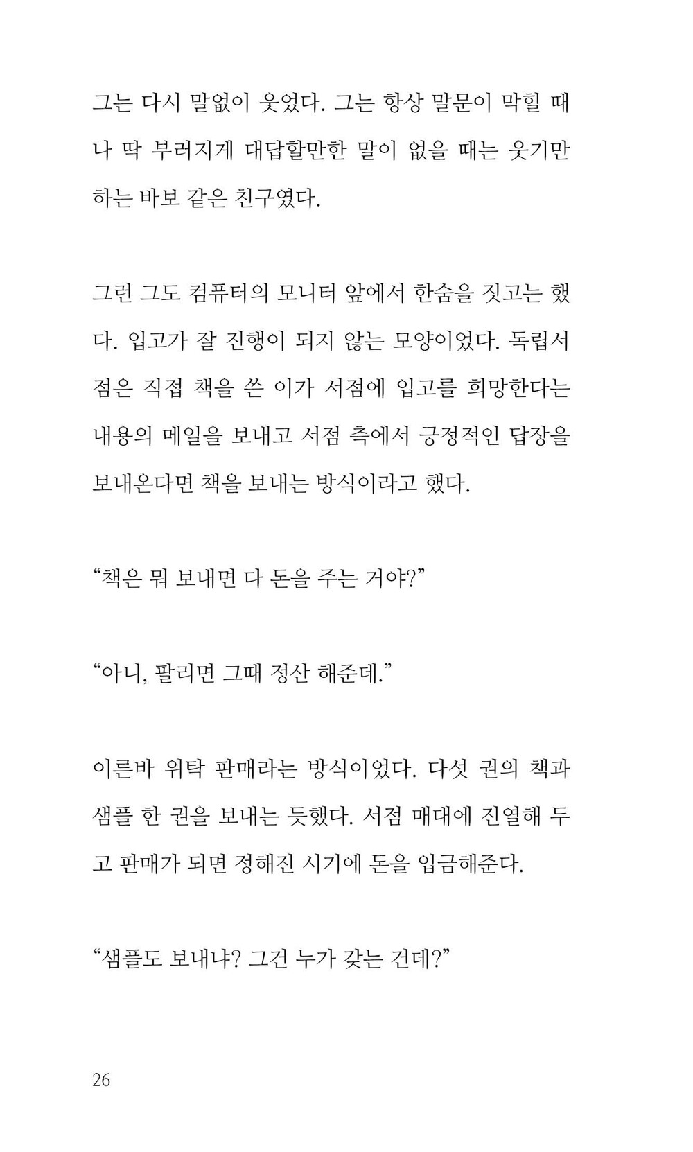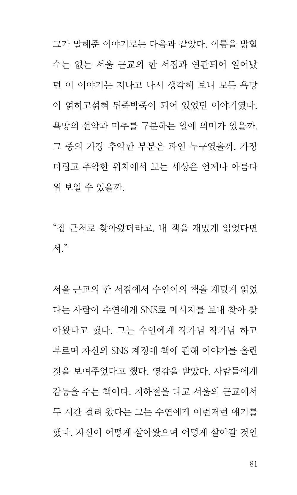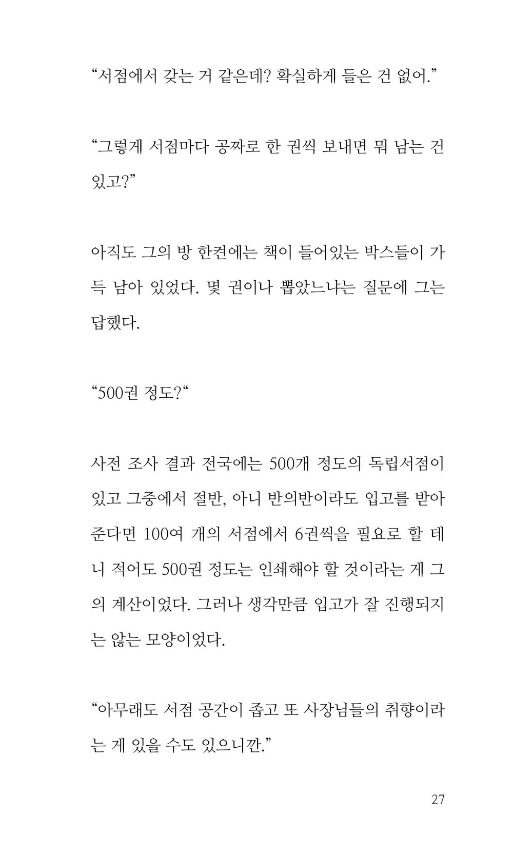 이후로는 매번 친구는 새 책이 나올 때마다 이 서점에선 입고를 전혀 받아주지 않을 거라는 것을 알면서도 그가 자신으로 인해 조금쯤 당황스럽기를 바라는 마음에 메일을 보냈다고 했다.