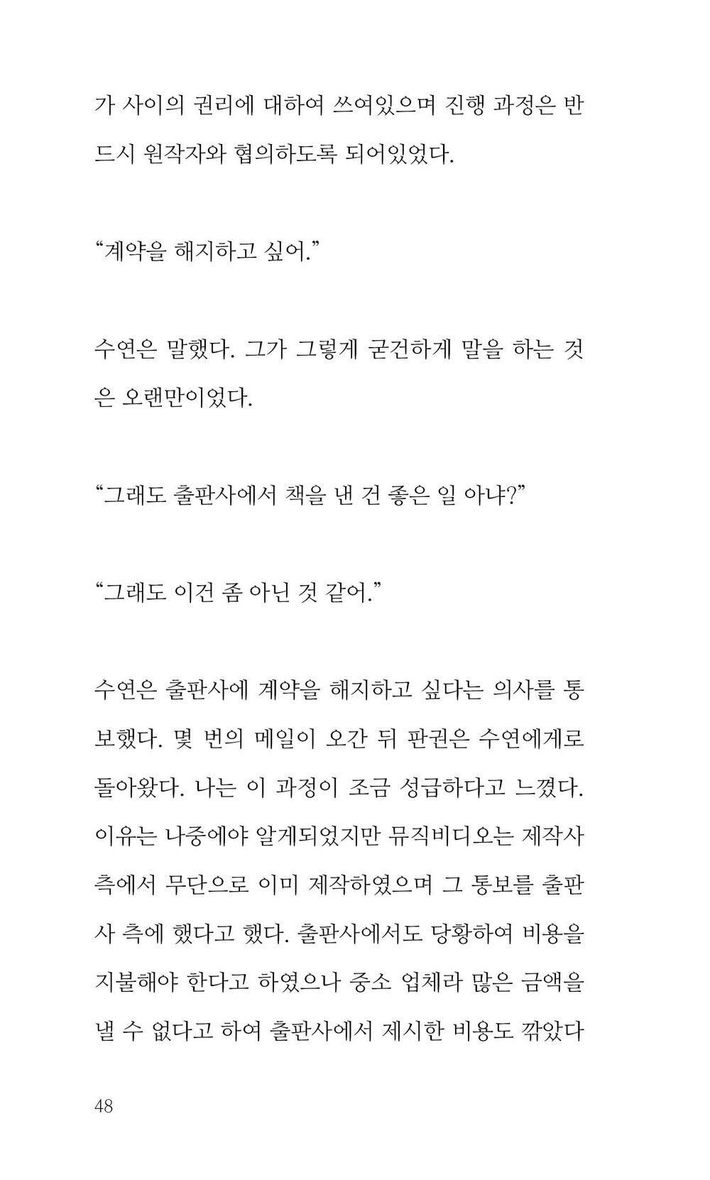 수연이는 출판사와 같이 상의해야 하는 문제라고 하고 출판사의 연락처를 알려주었다. 47