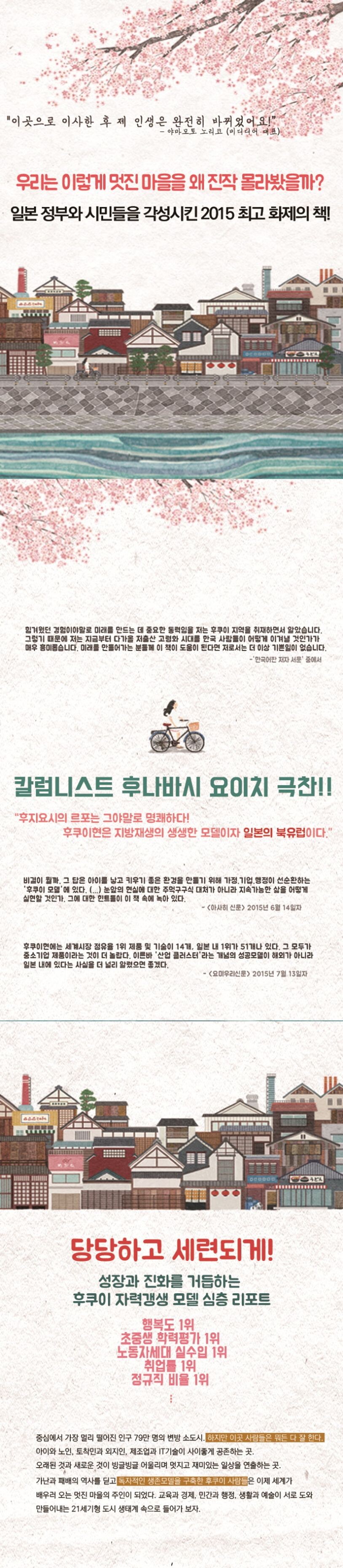그렇다면 왜 후쿠이현일까? 오랜 기간의 빈곤과 실패의 역사를 간직한 지역, 첩첩 산으로 둘러싸여 믿을 것은 사람밖에 없었던 마을. 살아남기 위해 지혜로워질 수밖에 없었던 후쿠이는 지금 일본을 너머 세계가 부러워하는 지속가능한 공동체의 모델로 각광받고 있다. 현대 자본주의 시스템이 한계에 부딪힌 21세기, 세련된 방식으로 성장과 진화를 거듭하는 후쿠이의 생생한 분투기에서 우리는 맞닥뜨린 숱한 문제를 해결할 수 있는 힌트를 얻게 될 수 있을 것이다.