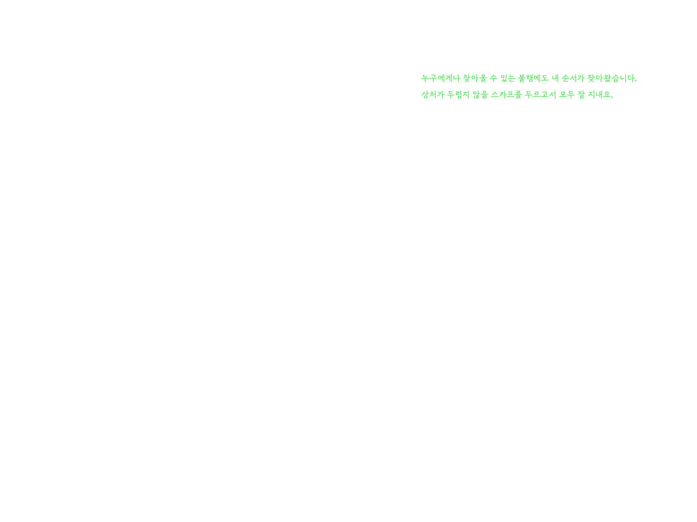 아프지 말지. 당신들도 나도, 어서 나아서 진료가 끝난 병원 문밖의 사람이 됩시다. 아무도 듣지 못하는 응원을 보낸다. p.70