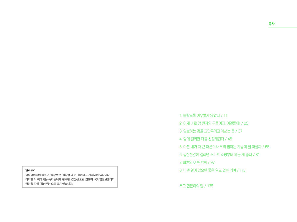 저 역시 여기에도 암에 걸린 사람이 있다고 조용히 손들기 위해 일기를 썼습니다. 질병의 종류와 아픔의 강도를 떠나, 겁먹은 누군가를 손잡아 주는 글이 되길 바랍니다.